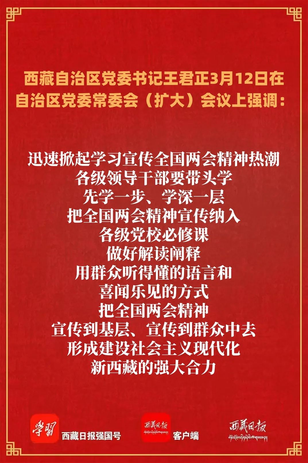 王君正強(qiáng)調(diào),要加強(qiáng)黨的全面領(lǐng)導(dǎo),持續(xù)改進(jìn)作風(fēng)、狠抓落實(shí),以高質(zhì)量黨建引領(lǐng)西藏長(zhǎng)治久安和高質(zhì)量發(fā)展。迅速掀起學(xué)習(xí)宣傳全國(guó)兩會(huì)精神熱潮,各級(jí)領(lǐng)導(dǎo)干部要帶頭學(xué),先學(xué)一步、學(xué)深一層,把全國(guó)兩會(huì)精神宣傳納入各級(jí)黨校必修課,做好解讀闡釋,用群眾聽得懂的語言和喜聞樂見的方式,把全國(guó)兩會(huì)精神宣傳到基層、宣傳到群眾中去,形成建設(shè)社會(huì)主義現(xiàn)代化新西藏的強(qiáng)大合力。持續(xù)改進(jìn)作風(fēng),弘揚(yáng)求真務(wù)實(shí)、真抓實(shí)干的工作作風(fēng),進(jìn)一步為基層減負(fù),鞏固拓展心齊氣順、勁足干事的良好氛圍。進(jìn)一步加強(qiáng)干部隊(duì)伍建設(shè),憑能力用干部、以實(shí)績(jī)論英雄,不斷提高干部駕馭社會(huì)主義市場(chǎng)經(jīng)濟(jì)的能力,建設(shè)忠誠(chéng)干凈擔(dān)當(dāng)?shù)母咚刭|(zhì)干部隊(duì)伍。加強(qiáng)人大政協(xié)工作,更好把各族人民的力量團(tuán)結(jié)起來、智慧凝聚起來,努力把制度優(yōu)勢(shì)轉(zhuǎn)化為治理效能,萬眾一心,為西藏長(zhǎng)治久安和高質(zhì)量發(fā)展、建設(shè)社會(huì)主義現(xiàn)代化新西藏而努力奮斗。