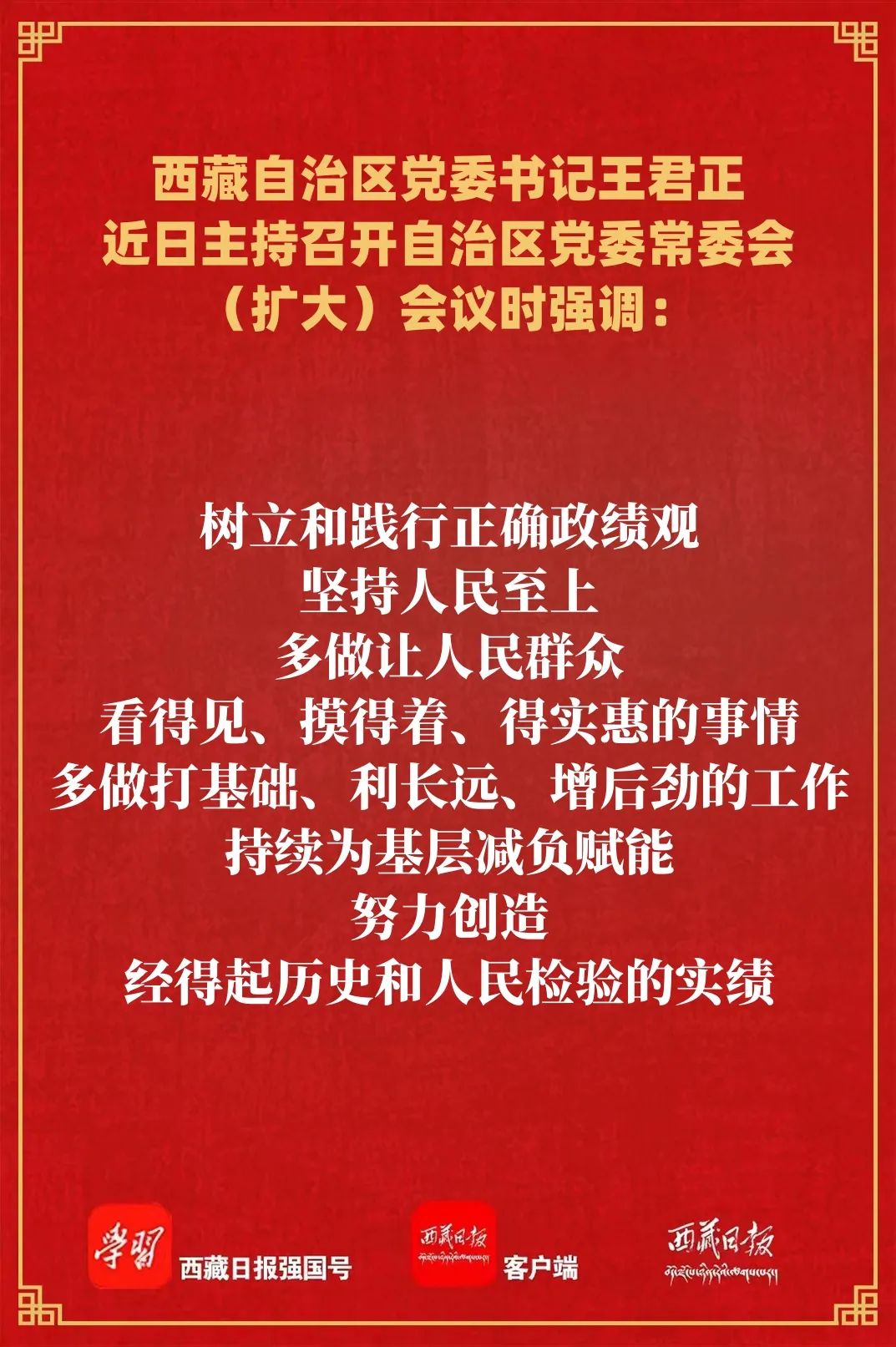 王君正強調,要恪盡職守、努力工作,推動黨中央決策部署和自治區黨委工作安排落到實處。堅持黨的全面領導,各級黨委要切實履行全面從嚴治黨政治責任,把黨的領導落實到經濟社會發展全過程,研究完善穩經濟政策措施,推動高質量完成“十四五”規劃目標任務,為實現“十五五”良好開局打牢基礎。樹立和踐行正確政績觀,堅持人民至上,多做讓人民群眾看得見、摸得著、得實惠的事情,多做打基礎、利長遠、增后勁的工作,持續為基層減負賦能,努力創造經得起歷史和人民檢驗的實績。持之以恒改進作風,嚴格落實中央八項規定及其實施細則精神,推進作風建設常態化長效化,堅持黨性黨風黨紀一起抓,健全風腐同查同治工作機制,推動黨員干部特別是領導干部養成良好工作作風,搶抓機遇、加快發展,以實際行動把習近平總書記為西藏明確的“穩定、發展、生態、強邊”四件大事落實到位,更好建設社會主義現代化新西藏。