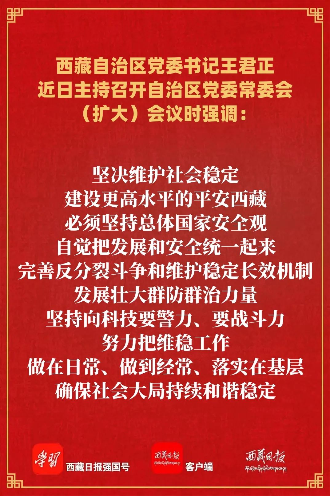王君正強調,要深入學習貫徹習近平總書記重要講話精神,大力推進平安西藏建設,努力提升社會治理體系和治理能力現代化水平。堅決維護社會穩定,建設更高水平的平安西藏,必須堅持總體國家安全觀,自覺把發展和安全統一起來,完善反分裂斗爭和維護穩定長效機制,發展壯大群防群治力量,堅持向科技要警力、要戰斗力,努力把維穩工作做在日常、做到經常、落實在基層,確保社會大局持續和諧穩定。進一步完善公共安全體系,堅持和發展新時代“楓橋經驗”,抓好源頭預防、排查調處、集體會商“三個環節”,提高問題分析研判、重點群體穩控、矛盾糾紛調處“三種能力”,建立多種力量協同、問題分流化解、責任倒查“三項機制”,一體推進專項治理、系統治理、依法治理,切實把矛盾風險隱患化解在基層、消除在萌芽狀態。完善社會工作體制機制,認真踐行社會主義核心價值觀,推進信訪工作法治化,強化城鄉社區治理和服務體系建設,推動社會組織健康有序發展,建設人人有責、人人盡責、人人享有的社會治理共同體。