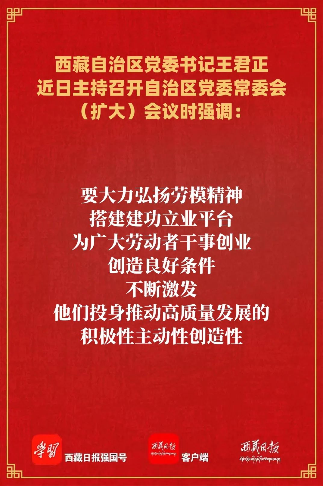 會議研究了西藏自治區全國勞動模范和先進工作者推薦評選有關工作。王君正強調,要大力弘揚勞模精神,搭建建功立業平臺,為廣大勞動者干事創業創造良好條件,不斷激發他們投身推動高質量發展的積極性主動性創造性。要做好先進典型宣傳報道工作,大力營造學習先進、爭當先進、趕超先進的濃厚社會氛圍,努力推動西藏經濟社會發展各項事業不斷取得新成效。