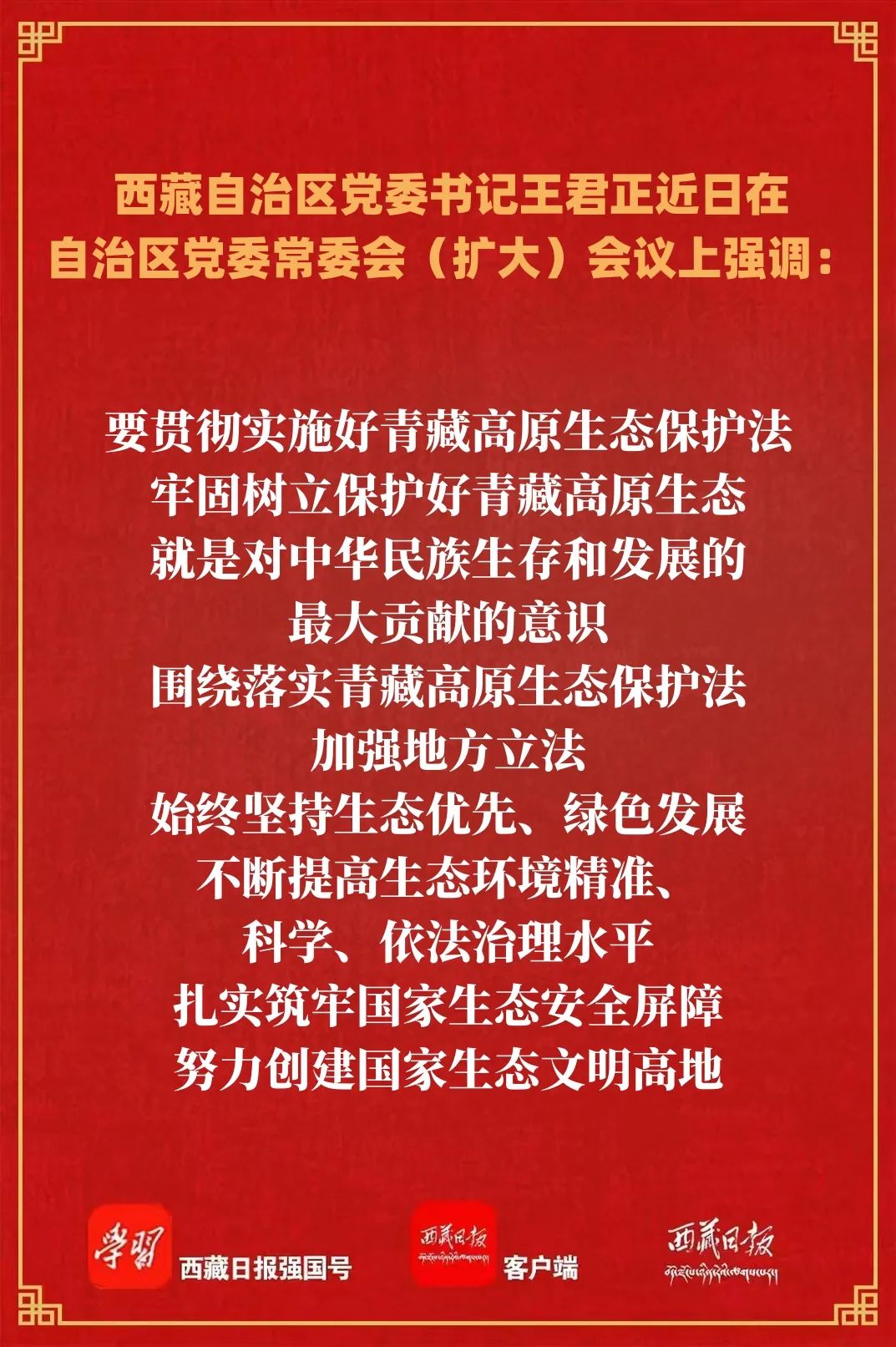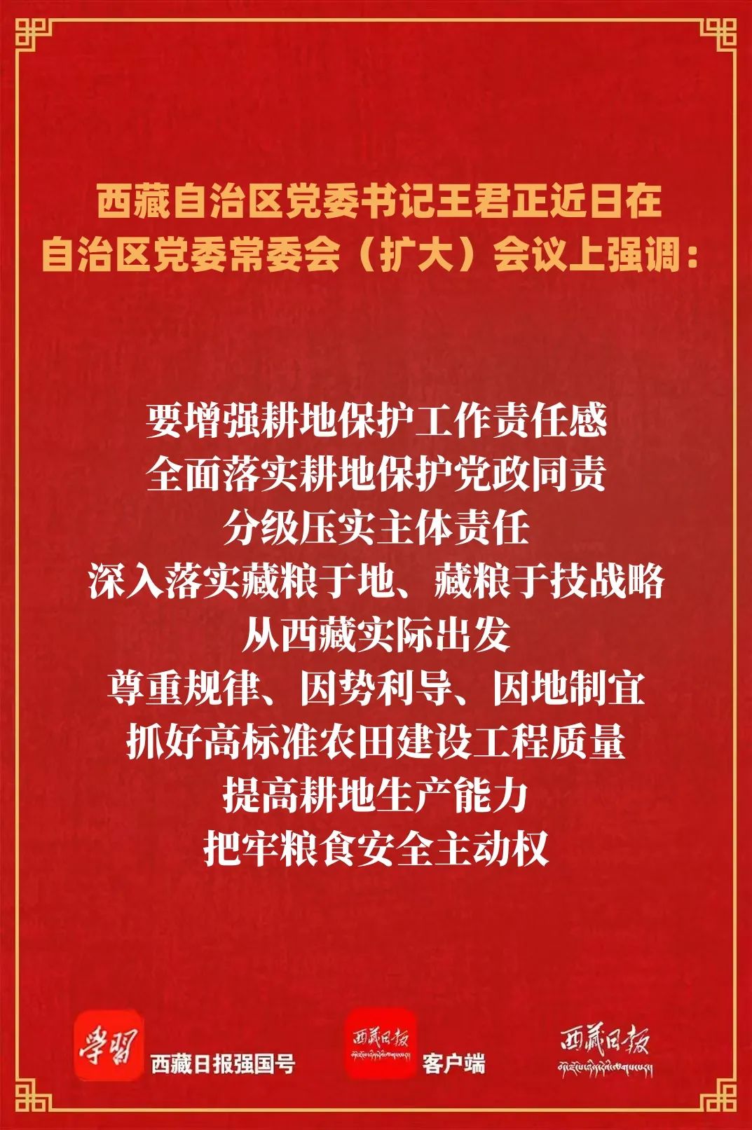 王君正強調,要貫徹實施好青藏高原生態保護法,牢固樹立保護好青藏高原生態就是對中華民族生存和發展的最大貢獻的意識,圍繞落實青藏高原生態保護法,加強地方立法,始終堅持生態優先、綠色發展,不斷提高生態環境精準、科學、依法治理水平,扎實筑牢國家生態安全屏障,努力創建國家生態文明高地。要增強耕地保護工作責任感,全面落實耕地保護黨政同責,分級壓實主體責任,深入落實藏糧于地、藏糧于技戰略,從西藏實際出發,尊重規律、因勢利導、因地制宜,抓好高標準農田建設工程質量,提高耕地生產能力,把牢糧食安全主動權。