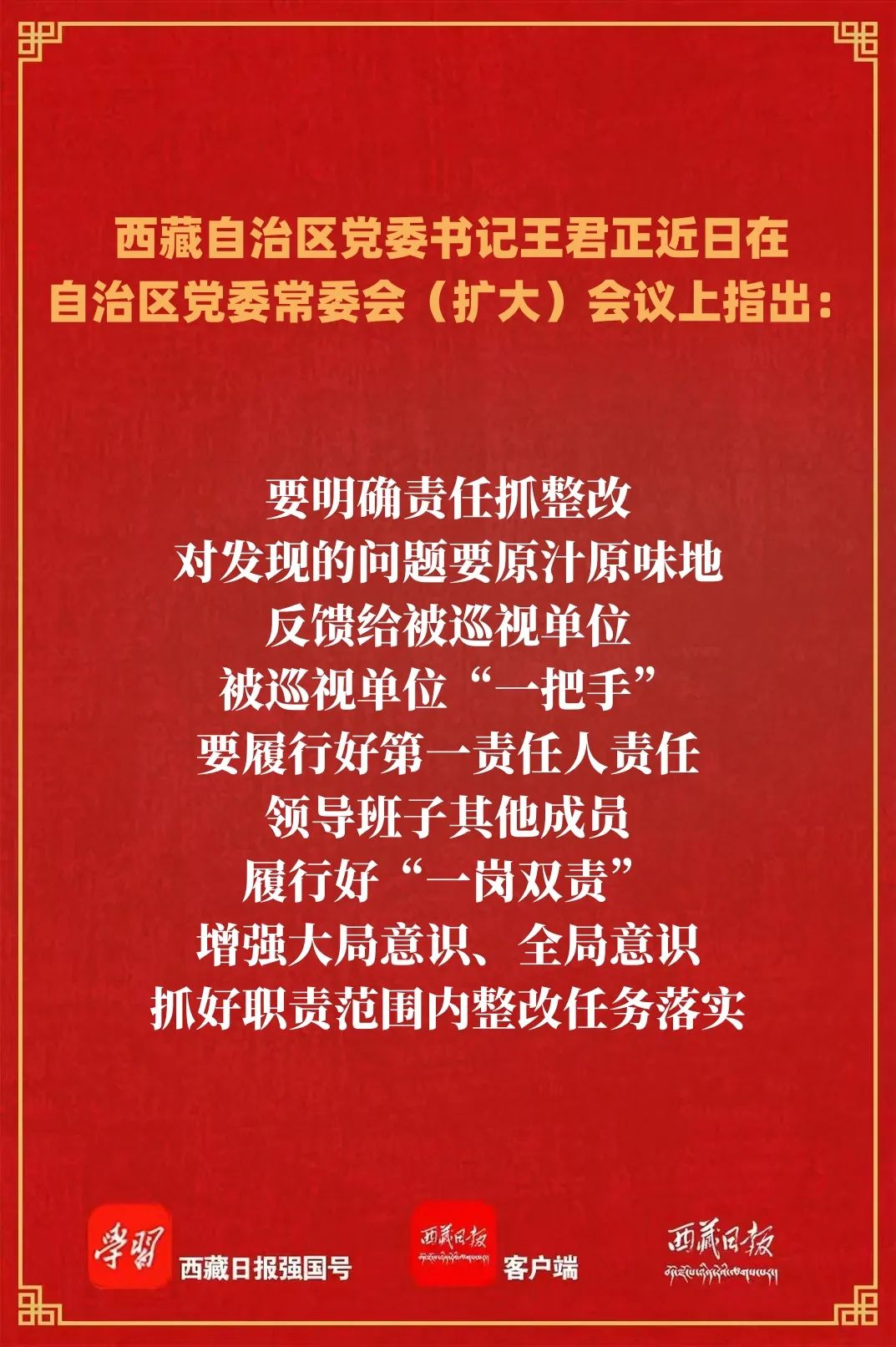 會議聽取了十屆自治區黨委第四輪巡視整改情況和第六輪巡視情況匯報。王君正指出,巡視是一場“政治體檢”、一次黨性錘煉,巡視整改是巡視的“后半篇文章”、是巡視監督成效的關鍵。各級黨委(黨組)要深入學習領會習近平總書記關于巡視工作的重要指示精神,把巡視整改作為擁護“兩個確立”、踐行“兩個維護”的實際行動,深化政治巡視,以巡促改、以巡促建、以巡促治,嚴肅查處通報典型案例,以對黨和人民高度負責的態度抓好巡視工作,切實發揮巡視利劍作用,確保中央巡視工作的基本方針落到實處、見到實效。要明確責任抓整改,對發現的問題要原汁原味地反饋給被巡視單位,被巡視單位“一把手”要履行好第一責任人責任,領導班子其他成員履行好“一崗雙責”,增強大局意識、全局意識,抓好職責范圍內整改任務落實。要協調聯動抓整改,被巡視單位要切實扛起整改主體責任,主動加強溝通聯絡;分管領導要加強督促指導,推動各部門積極履行職責、合力抓好整改。要明確任務抓整改,強化對巡視整改全過程領導、全方位統籌,建立健全整改機制,舉一反三、延伸拓展,既著力“當下改”又著眼“長久立”,做到解決一類問題、完善一套制度,更好發揮巡視標本兼治作用。要強化監督抓整改,紀檢監察機關、組織部門要落實整改全面監督責任、日常監督責任,把日常督促和檢查抽查結合起來,及時開展“回頭看”,強化精準督查,增強督查實效,推動真改實改。要鞏固成效抓整改,把巡視整改同正在開展的深入貫徹中央八項規定精神學習教育結合起來,同全面從嚴治黨、重點工作、干部隊伍建設結合起來,進一步完善工作機制,堵塞工作漏洞,嚴肅工作紀律,切實推動整改成效轉化為治理效能,努力提升建設社會主義現代化新西藏的能力水平。