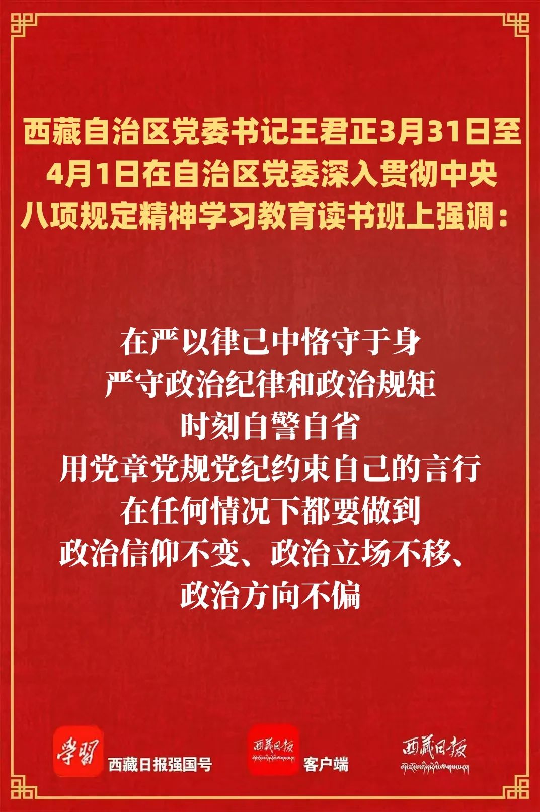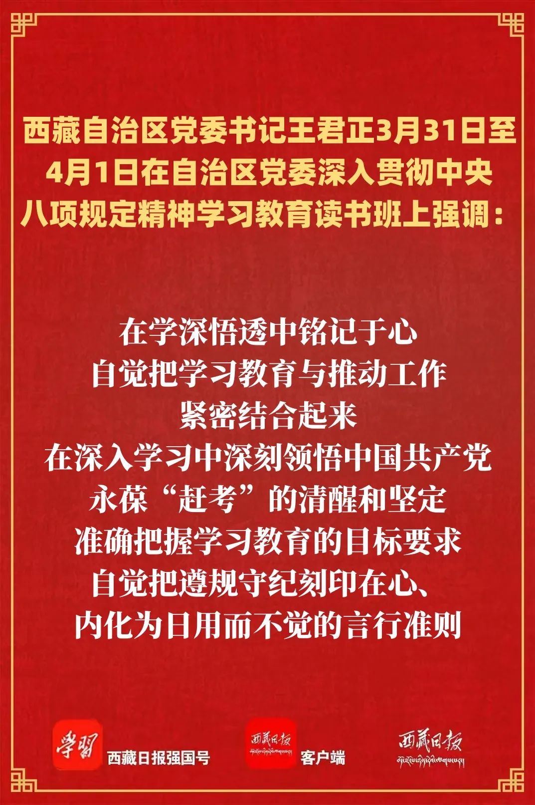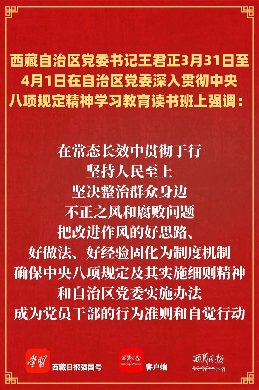 3月31日至4月1日,自治區黨委深入貫徹中央八項規定精神學習教育讀書班在拉薩舉行。自治區黨委書記王君正主持并講話,強調,要深入學習貫徹習近平總書記關于加強黨的作風建設的重要論述,領導干部要充分發揮示范帶頭作用,堅決貫徹執行中央八項規定精神,持續鞏固風清氣正的政治生態。