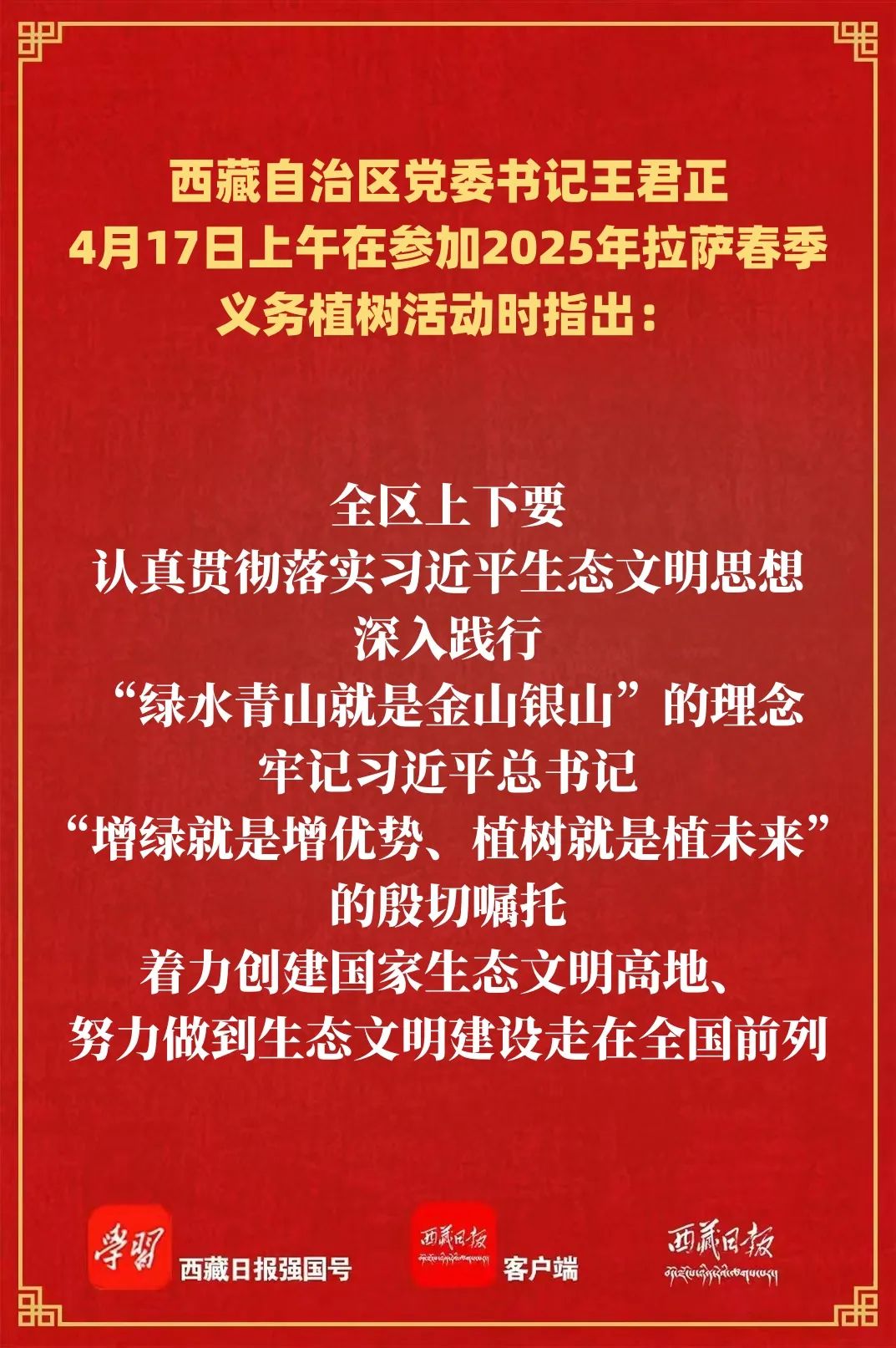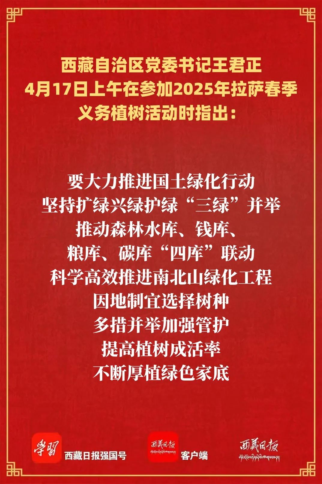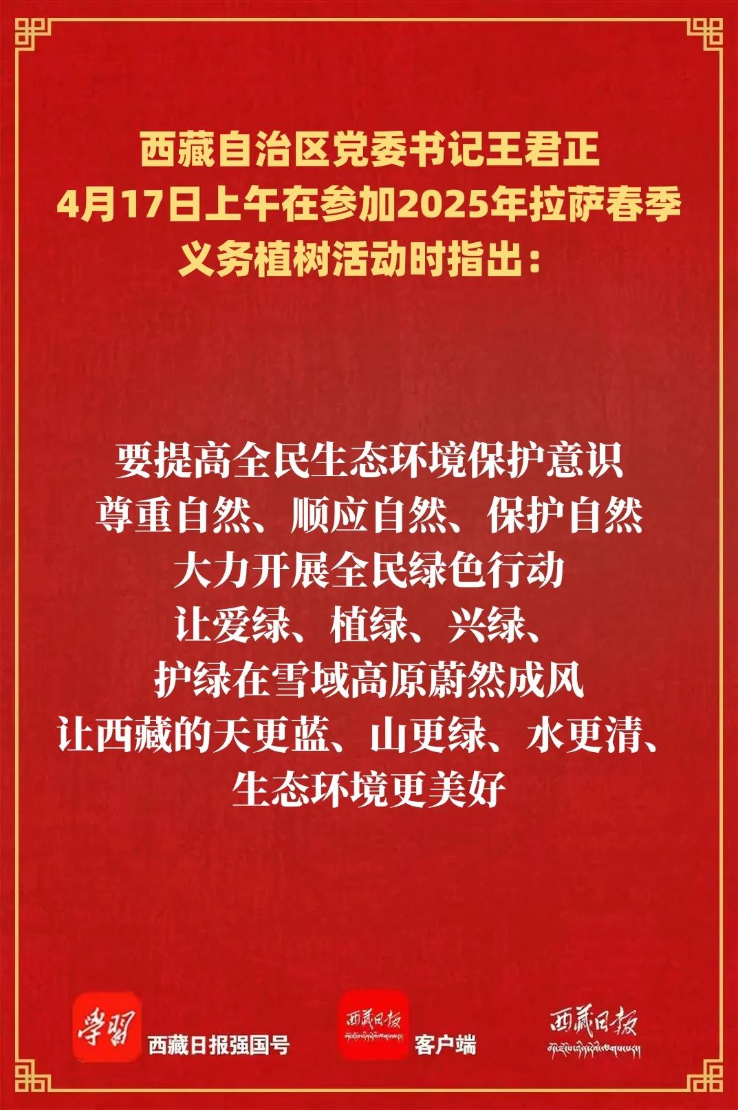 春風催新綠,植樹正當時。4月17日上午,自治區黨委書記王君正在參加2025年拉薩春季義務植樹活動時強調,要深入學習貫徹習近平生態文明思想,持之以恒推進國土綠化行動,提高全民生態環境保護意識,為大地增綠、為生活添彩。