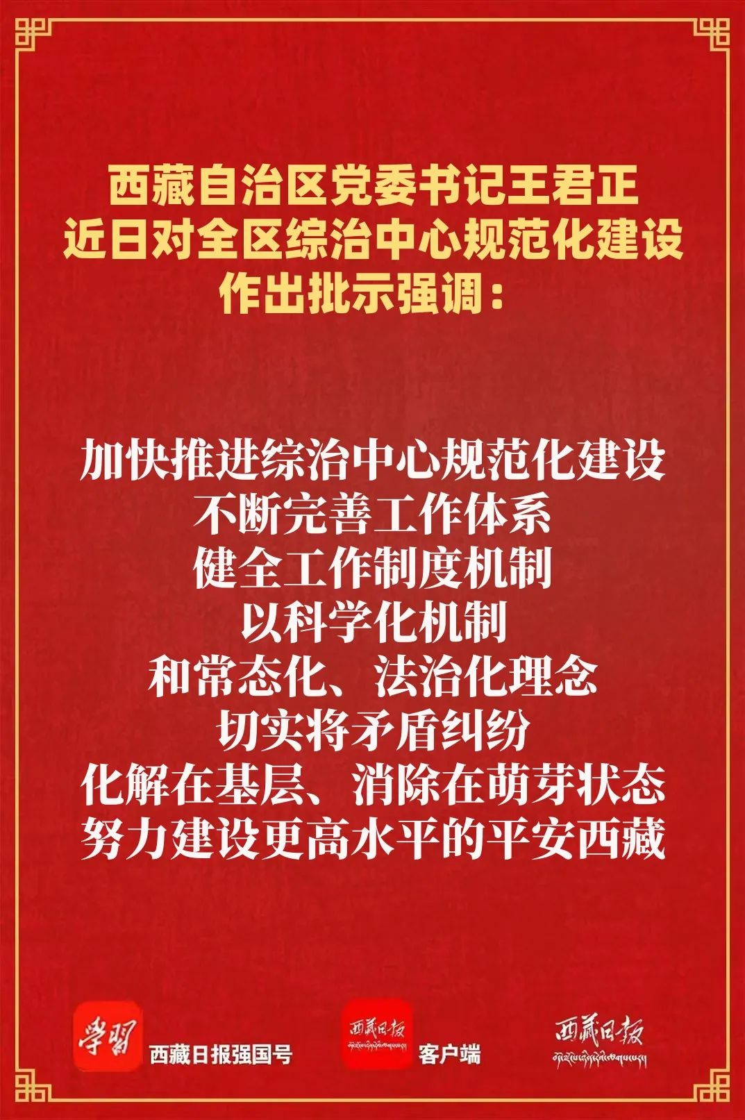 王君正要求,全區各級黨委要加強領導,不斷提高綜治工作水平,為建設社會主義現代化新西藏提供堅強有力的支撐保障。