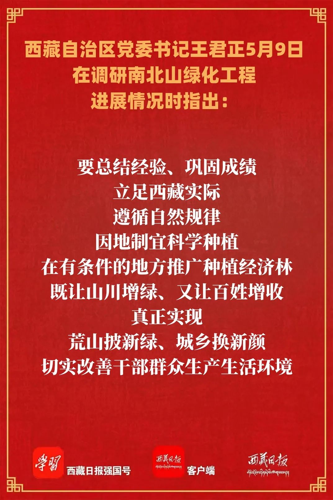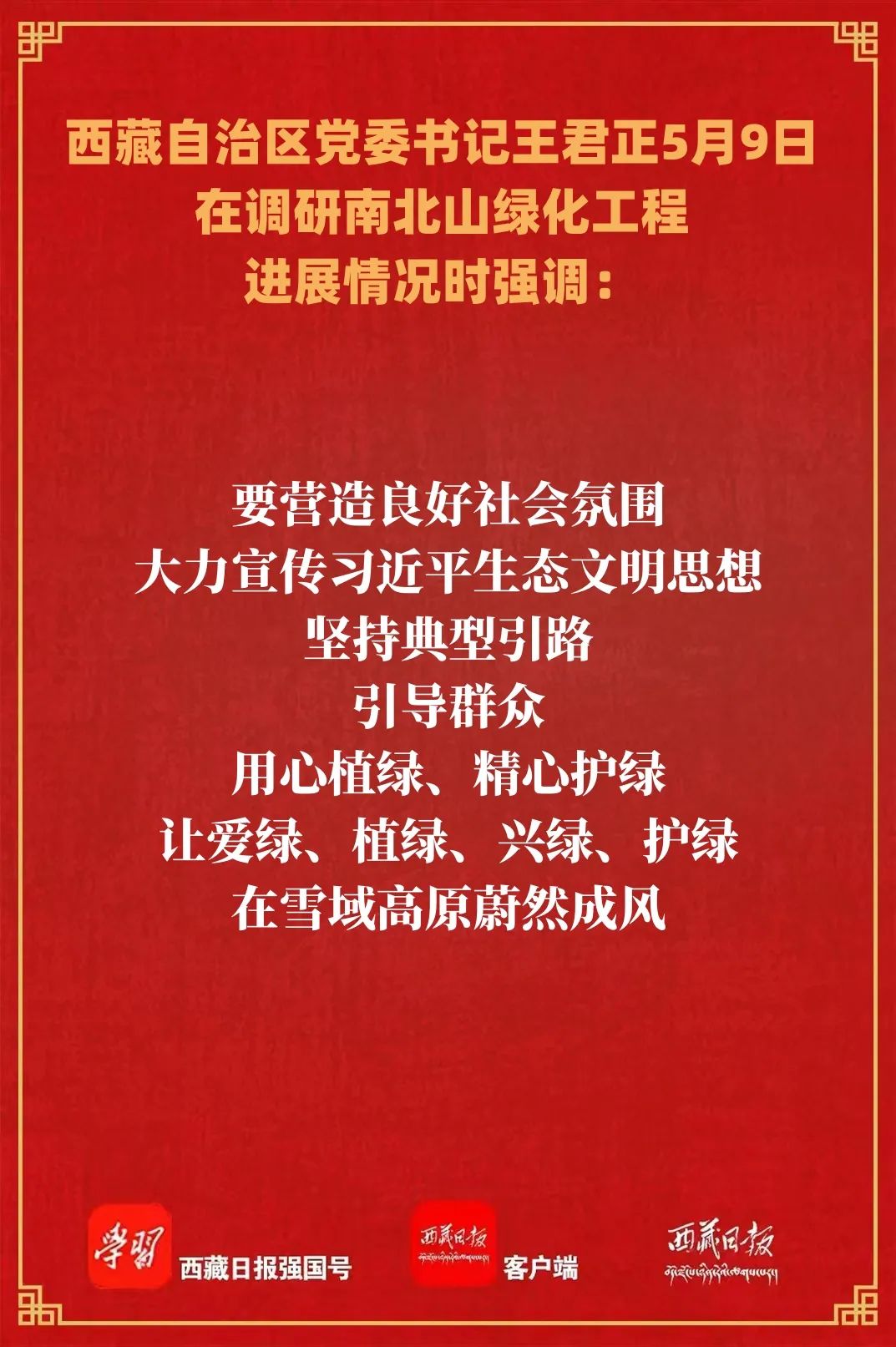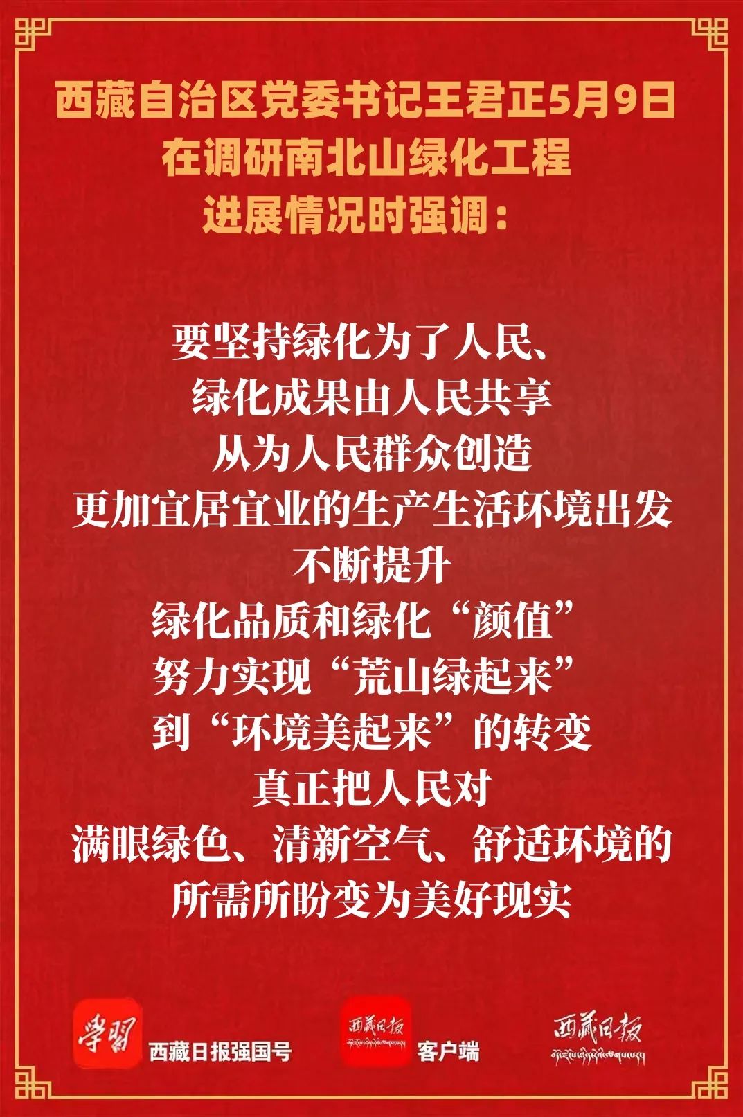 5月9日,自治區黨委書記王君正在拉薩市調研南北山綠化工程進展情況。強調,要深入貫徹落實習近平生態文明思想,樹牢“兩山”理念,科學開展國土綠化行動,堅持一張藍圖繪到底,一茬接著一茬種,一代接著一代干,不斷提升國土綠化工作水平,努力創建國家生態文明高地。