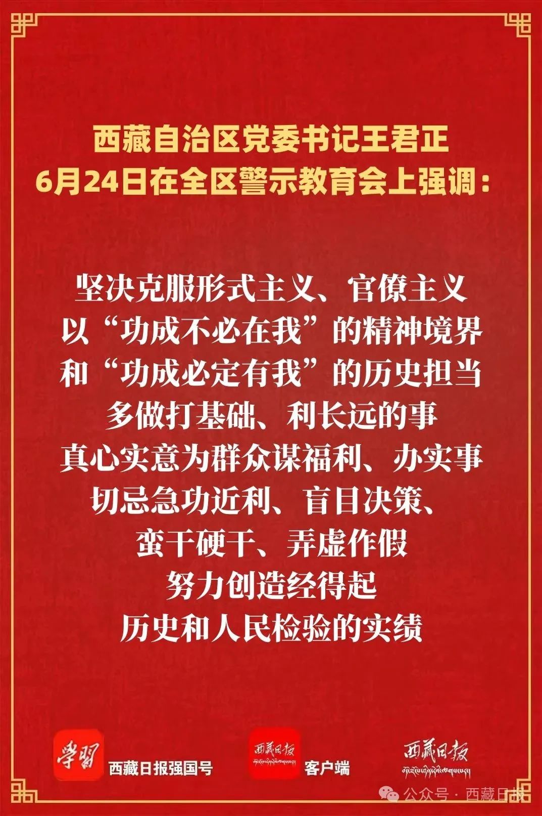 王君正強(qiáng)調(diào),要堅(jiān)持以案為鑒、警鐘長(zhǎng)鳴,進(jìn)一步筑牢正風(fēng)肅紀(jì)、拒腐防變的思想防線。提高政治站位、堅(jiān)持黨性原則,堅(jiān)定做政治上的明白人。深入學(xué)習(xí)貫徹習(xí)近平總書記關(guān)于西藏工作的重要指示和新時(shí)代黨的治藏方略,堅(jiān)持不懈用黨的創(chuàng)新理論武裝頭腦、指導(dǎo)實(shí)踐、推動(dòng)工作;嚴(yán)明政治紀(jì)律和政治規(guī)矩,自覺(jué)用“七個(gè)有之”自警自省,做到言行一致、表里如一,始終在思想上政治上行動(dòng)上同以習(xí)近平同志為核心的黨中央保持高度一致。堅(jiān)持人民至上、踐行人民宗旨,堅(jiān)定做各族群眾的貼心人。堅(jiān)持人民立場(chǎng),走好新時(shí)代黨的群眾路線,自覺(jué)同人民群眾想在一起、干在一起,把群眾身邊的小事當(dāng)作黨委、政府的大事來(lái)抓,著力解決群眾最關(guān)心最直接最現(xiàn)實(shí)的利益問(wèn)題,讓改革發(fā)展成果更多更公平惠及人民群眾。改進(jìn)作風(fēng)、狠抓落實(shí),堅(jiān)定做干事創(chuàng)業(yè)的帶頭人。增強(qiáng)大局意識(shí),善于把自身工作置于全局中思考謀劃推動(dòng),找準(zhǔn)在發(fā)展中的定位,讓工作舉措更加符合全局需要、更有利于地方和部門長(zhǎng)遠(yuǎn)發(fā)展,謀事要勤、做事要細(xì)、成事要實(shí),在其位謀其政盡其責(zé),真正做到恪盡職守。牢固樹(shù)立正確政績(jī)觀,堅(jiān)定做實(shí)干奉獻(xiàn)的奮斗者。堅(jiān)決克服形式主義、官僚主義,以“功成不必在我”的精神境界和“功成必定有我”的歷史擔(dān)當(dāng),多做打基礎(chǔ)、利長(zhǎng)遠(yuǎn)的事,真心實(shí)意為群眾謀福利、辦實(shí)事,切忌急功近利、盲目決策、蠻干硬干、弄虛作假,努力創(chuàng)造經(jīng)得起歷史和人民檢驗(yàn)的實(shí)績(jī)。嚴(yán)守紀(jì)律規(guī)矩、堅(jiān)守清正廉潔,堅(jiān)定做嚴(yán)以律己的踐行者。牢固樹(shù)立正確的權(quán)力觀,時(shí)刻以黨章黨規(guī)黨紀(jì)為鏡,嚴(yán)以修身、嚴(yán)以用權(quán)、嚴(yán)以律己,模范踐行社會(huì)主義核心價(jià)值觀,本色做人、角色做事,嚴(yán)把政治關(guān)、權(quán)力關(guān)、交往關(guān)、生活關(guān)、親情關(guān),自覺(jué)凈化社交圈、生活圈、朋友圈,以良好家風(fēng)促進(jìn)黨風(fēng)政風(fēng)、帶動(dòng)社風(fēng)民風(fēng)。