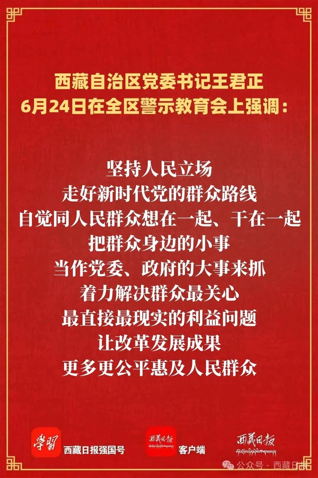 6月24日,全區(qū)警示教育會(huì)在拉薩召開(kāi)。自治區(qū)黨委書記王君正主持會(huì)議并講話。他強(qiáng)調(diào),要深入學(xué)習(xí)貫徹習(xí)近平總書記關(guān)于加強(qiáng)黨的作風(fēng)建設(shè)重要論述,持之以恒抓好中央八項(xiàng)規(guī)定精神貫徹落實(shí),為社會(huì)主義現(xiàn)代化新西藏建設(shè)提供堅(jiān)強(qiáng)保證。