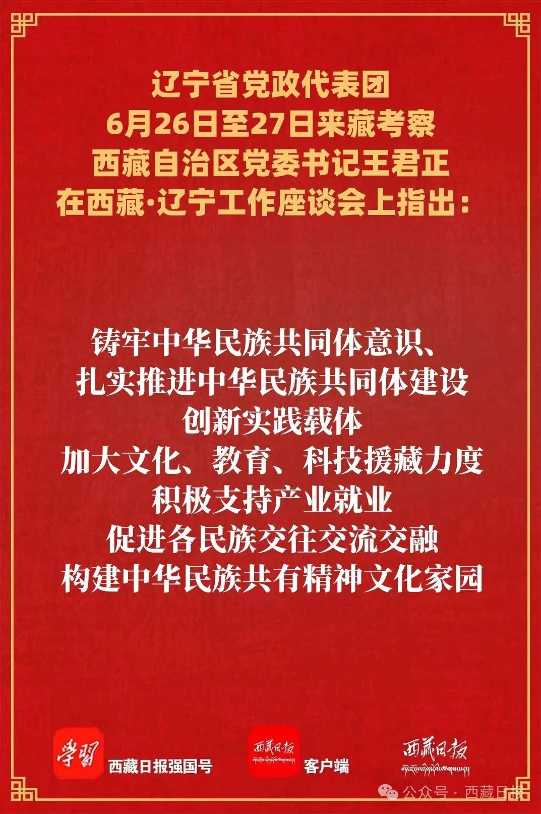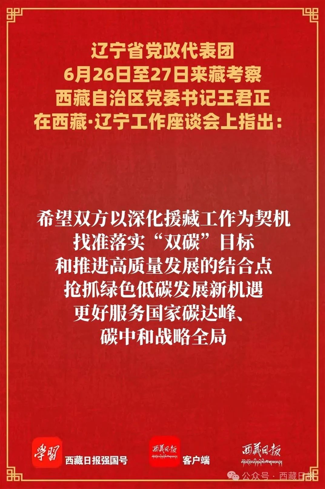 王君正指出,中華民族大家庭血脈相連、命運(yùn)與共。我們要共同學(xué)習(xí)貫徹習(xí)近平總書記重要指示精神,努力推動(dòng)兩地經(jīng)濟(jì)社會(huì)高質(zhì)量發(fā)展。鑄牢中華民族共同體意識(shí)、扎實(shí)推進(jìn)中華民族共同體建設(shè),創(chuàng)新實(shí)踐載體,加大文化、教育、科技援藏力度,積極支持產(chǎn)業(yè)就業(yè),促進(jìn)各民族交往交流交融,構(gòu)建中華民族共有精神文化家園。揚(yáng)長避短、推動(dòng)經(jīng)濟(jì)高質(zhì)量發(fā)展,希望遼寧發(fā)揮我國重要工業(yè)基地作用和科技產(chǎn)業(yè)優(yōu)勢,推動(dòng)清潔能源、高原輕工業(yè)等產(chǎn)業(yè)發(fā)展,推動(dòng)科技成果轉(zhuǎn)化為現(xiàn)實(shí)生產(chǎn)力,更好把西藏資源優(yōu)勢轉(zhuǎn)化為經(jīng)濟(jì)優(yōu)勢、發(fā)展優(yōu)勢。關(guān)注民生建設(shè)、增強(qiáng)群眾獲得感幸福感安全感,圍繞人口、人心、人才等深層次問題,聚焦群眾最關(guān)心最直接最現(xiàn)實(shí)的利益問題,從“關(guān)鍵小事”入手,辦好“民生大事”,夯實(shí)黨在西藏的執(zhí)政根基。加大援藏工作力度、推進(jìn)生態(tài)文明建設(shè),西藏自然資源豐富、清潔能源富集,有條件有責(zé)任有能力為“雙碳”目標(biāo)作貢獻(xiàn),希望雙方以深化援藏工作為契機(jī),找準(zhǔn)落實(shí)“雙碳”目標(biāo)和推進(jìn)高質(zhì)量發(fā)展的結(jié)合點(diǎn),搶抓綠色低碳發(fā)展新機(jī)遇,更好服務(wù)國家碳達(dá)峰、碳中和戰(zhàn)略全局。