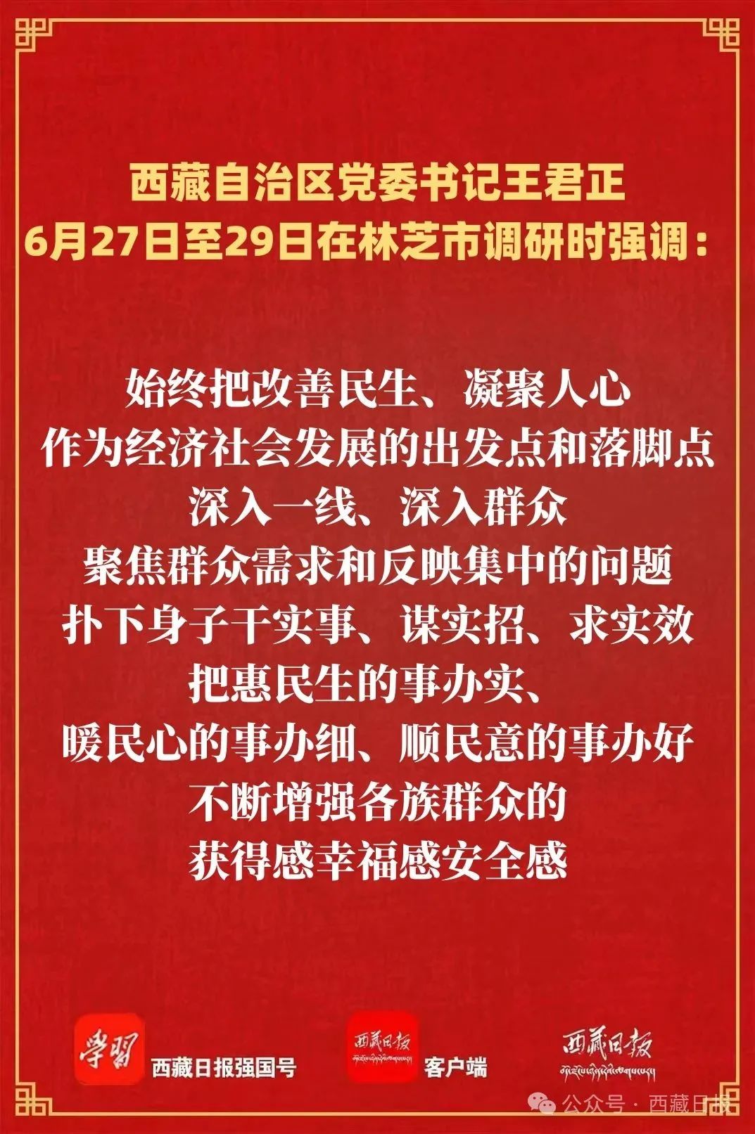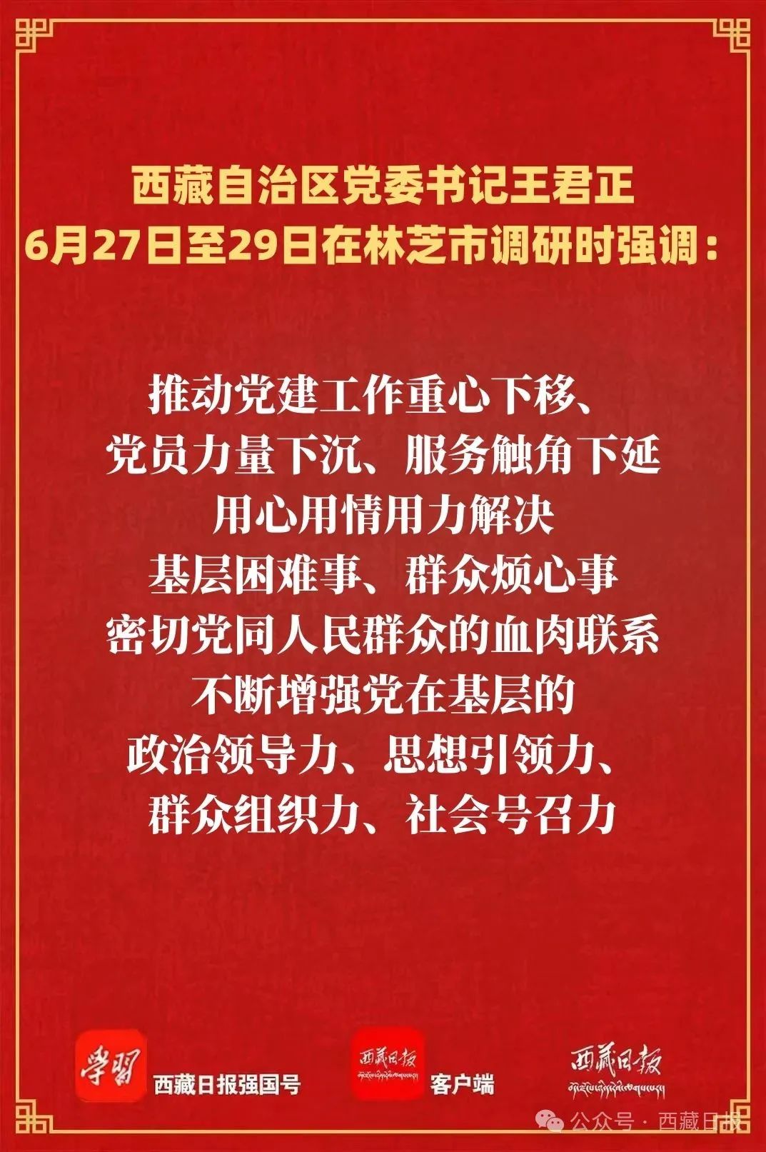 6月27日至29日,自治區黨委書記王君正深入林芝市巴宜區、經開區調研,開展“七一”走訪慰問。他強調,要堅決貫徹落實習近平總書記重要指示精神,進一步樹牢大抓基層鮮明導向,扎實抓好基層黨組織建設,充分發揮黨支部戰斗堡壘作用和黨員先鋒模范作用,為社會主義現代化新西藏建設提供堅強保障。