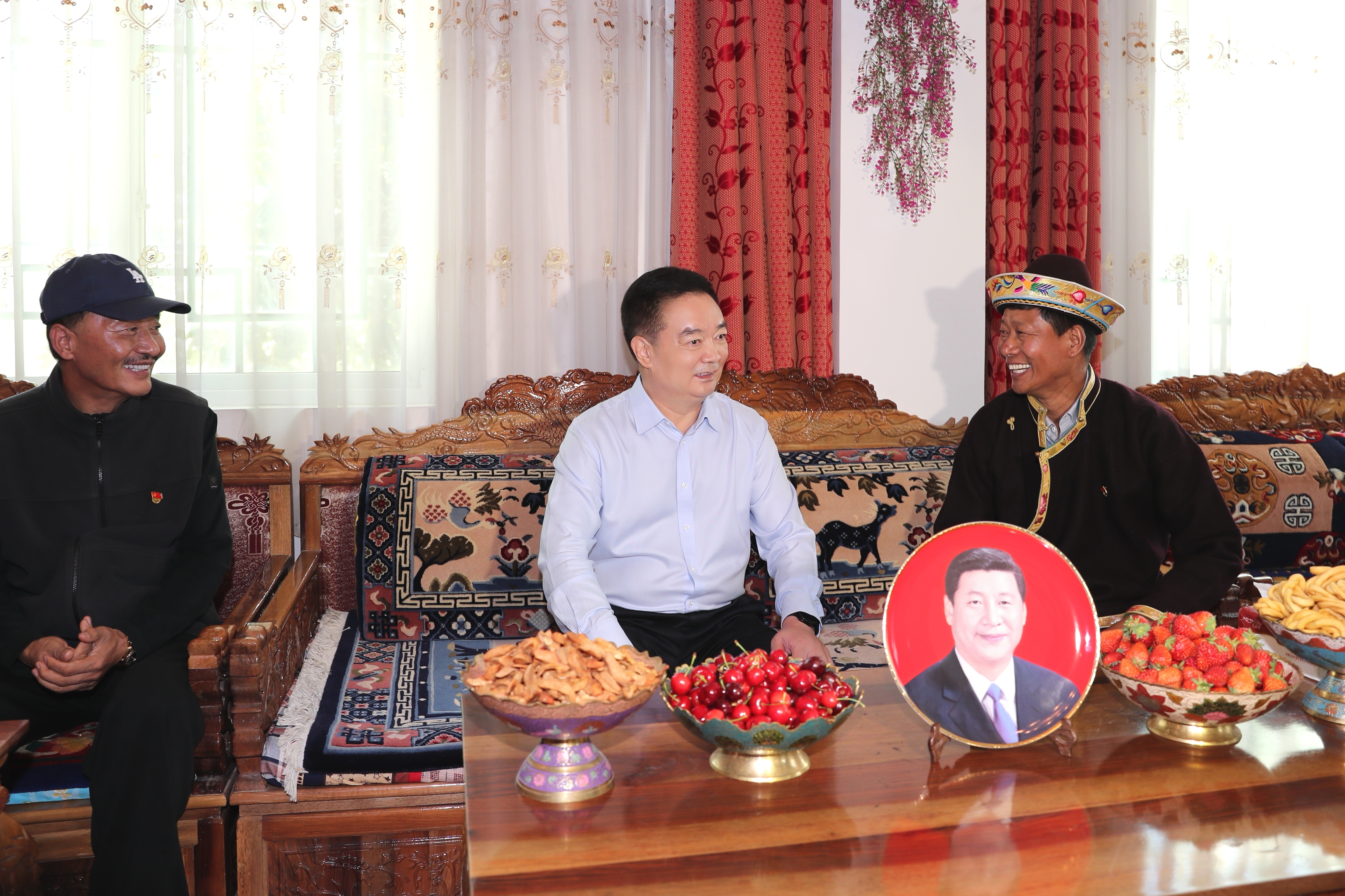 6月27日至29日,自治區黨委書記王君正深入林芝市巴宜區、經開區調研,開展“七一”走訪慰問。這是王君正和基層老黨員、全國民族團結先進個人格桑旺久一家人圍坐在客廳聊家常。記者 白瑪澤旺 攝
