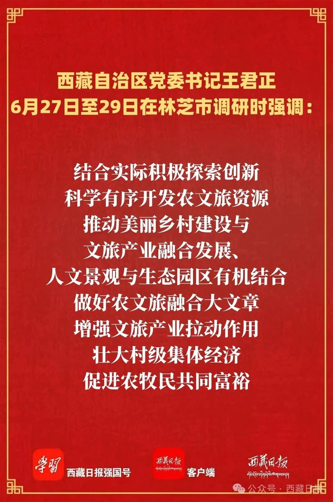 調研中,王君正強調,要完整準確全面貫徹新發展理念,按照做強縣域、培育小鎮、提升園區、振興鄉村的思路,因地制宜探索富民強縣路徑,圍繞延鏈補鏈強鏈,打造一批高原特色龍頭企業,積極培育鄉村旅游、休閑農業等新產業新業態,形成特色產業集群,加快縣域經濟高質量發展。要把農文旅融合發展作為推動鄉村振興的重要抓手,結合實際積極探索創新,科學有序開發農文旅資源,推動美麗鄉村建設與文旅產業融合發展、人文景觀與生態園區有機結合,做好農文旅融合大文章,增強文旅產業拉動作用,壯大村級集體經濟,促進農牧民共同富裕。要堅持“三個賦予一個有利于”總要求,始終把改善民生、凝聚人心作為經濟社會發展的出發點和落腳點,深入一線、深入群眾,聚焦群眾需求和反映集中的問題,撲下身子干實事、謀實招、求實效,把惠民生的事辦實、暖民心的事辦細、順民意的事辦好,不斷增強各族群眾的獲得感幸福感安全感。要堅持不懈抓基層、強基礎,推動黨建工作重心下移、黨員力量下沉、服務觸角下延,用心用情用力解決基層困難事、群眾煩心事,密切黨同人民群眾的血肉聯系,不斷增強黨在基層的政治領導力、思想引領力、群眾組織力、社會號召力,切實把基層黨組織建設成為鑄牢中華民族共同體意識、帶領群眾致富、維護社會穩定、守衛邊疆領土、開展反分裂斗爭的堅強戰斗堡壘。當前,全區上下正扎實開展深入貫徹中央八項規定精神學習教育,要鍥而不舍落實中央八項規定精神,重實效、強實干、抓落實,以作風建設新成效推動經濟社會高質量發展。
