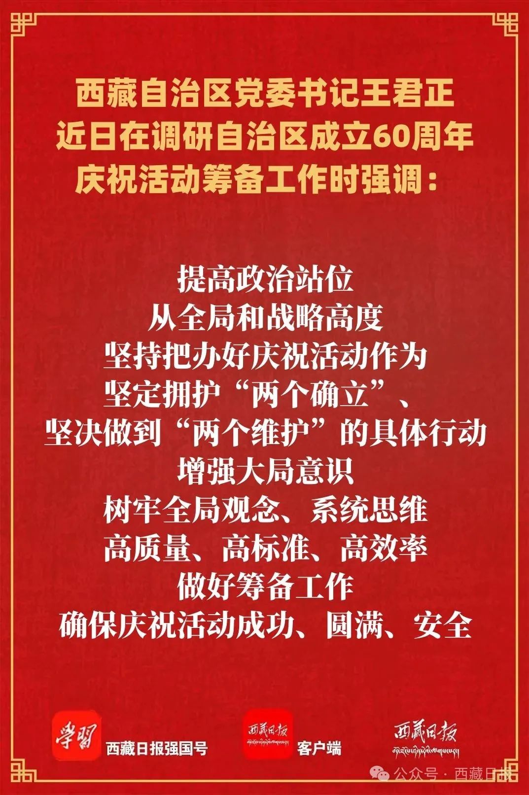 自治區(qū)成立60周年慶祝活動(dòng),是西藏各族人民政治生活中的一件大事。以王君正書記為班長的自治區(qū)黨委高度重視,先后召開自治區(qū)黨委常委會(huì)會(huì)議、領(lǐng)導(dǎo)小組會(huì)議等,統(tǒng)籌謀劃、系統(tǒng)部署,認(rèn)真研究、強(qiáng)力推進(jìn),建立工作機(jī)制,壓實(shí)職責(zé)任務(wù),狠抓督促落實(shí),各項(xiàng)籌備工作取得積極成效。