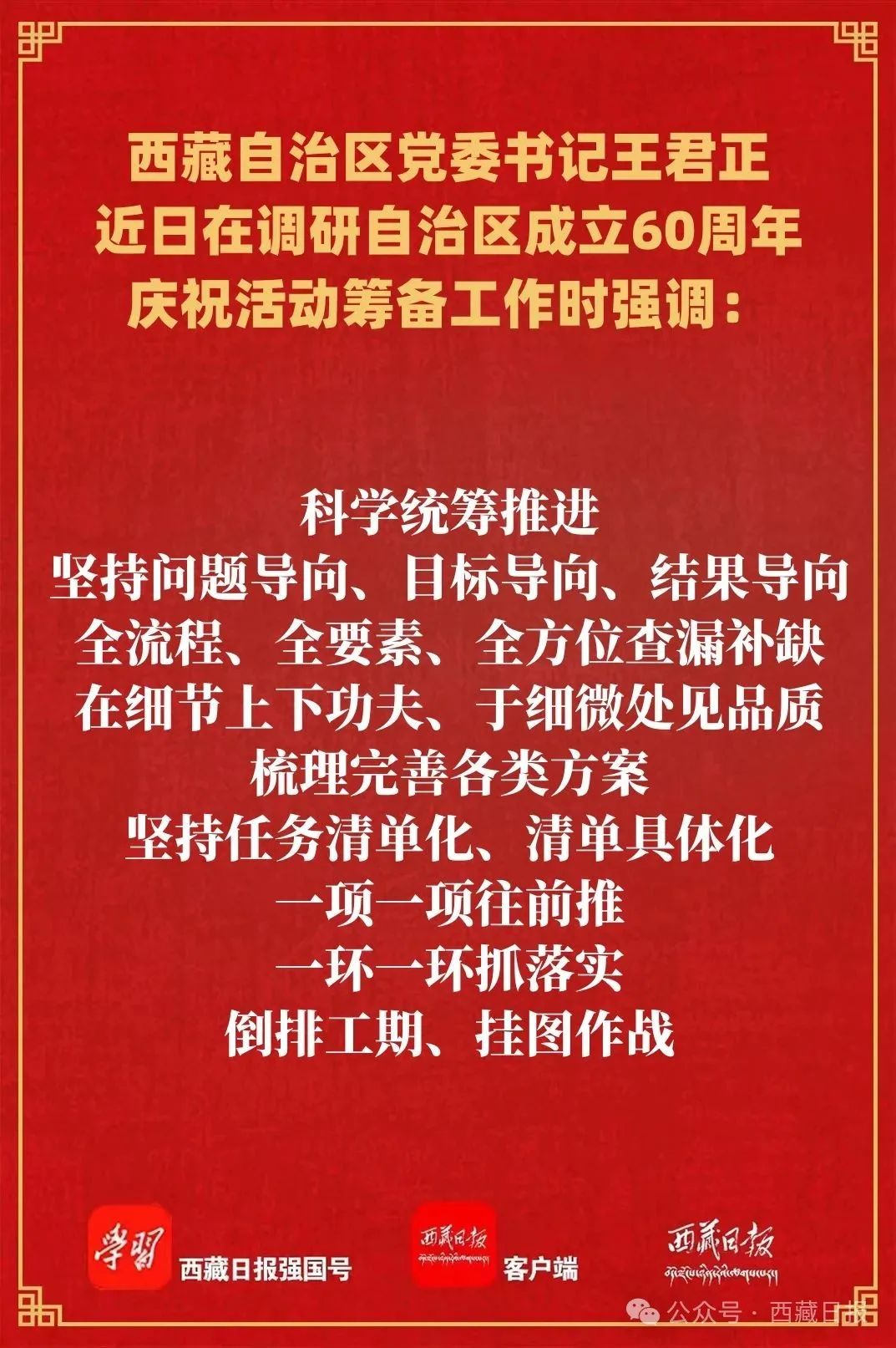 王君正強(qiáng)調(diào),辦好自治區(qū)成立60周年慶祝活動(dòng),是全區(qū)各級各部門的重要職責(zé)和使命。要提高政治站位,從全局和戰(zhàn)略高度,堅(jiān)持把辦好慶祝活動(dòng)作為堅(jiān)定擁護(hù)“兩個(gè)確立”、堅(jiān)決做到“兩個(gè)維護(hù)”的具體行動(dòng),增強(qiáng)大局意識,樹牢全局觀念、系統(tǒng)思維,高質(zhì)量、高標(biāo)準(zhǔn)、高效率做好籌備工作,確保慶祝活動(dòng)成功、圓滿、安全。科學(xué)統(tǒng)籌推進(jìn),堅(jiān)持問題導(dǎo)向、目標(biāo)導(dǎo)向、結(jié)果導(dǎo)向,全流程、全要素、全方位查漏補(bǔ)缺,在細(xì)節(jié)上下功夫、于細(xì)微處見品質(zhì),梳理完善各類方案,堅(jiān)持任務(wù)清單化、清單具體化,一項(xiàng)一項(xiàng)往前推,一環(huán)一環(huán)抓落實(shí),倒排工期、掛圖作戰(zhàn)。突出西藏特色,緊扣時(shí)代主題、緊貼群眾生活,精益求精、呈現(xiàn)亮點(diǎn),充分展示西藏長治久安和高質(zhì)量發(fā)展的蓬勃生機(jī),充分展示雪域兒女建設(shè)美麗幸福西藏、共圓偉大復(fù)興夢想的昂揚(yáng)風(fēng)貌。強(qiáng)化責(zé)任落實(shí),壓緊壓實(shí)領(lǐng)導(dǎo)責(zé)任、屬地責(zé)任、部門責(zé)任,在優(yōu)化、完善、提升上下更大功夫,細(xì)化分解職責(zé)任務(wù),主動(dòng)擔(dān)當(dāng)作為,密切協(xié)作配合,抓住重點(diǎn)和關(guān)鍵,分清輕重緩急,齊心協(xié)力推進(jìn)各項(xiàng)工作。加強(qiáng)宣傳引導(dǎo),堅(jiān)持以鑄牢中華民族共同體意識為主線,努力在群眾參與上下功夫,開展形式多樣、豐富多彩、具有西藏特點(diǎn)的群眾性慶祝活動(dòng),生動(dòng)講好西藏故事、傳播好西藏聲音,全方位、多角度、立體化展示西藏良好形象,營造隆重?zé)崃业臐夂穹諊?/p>