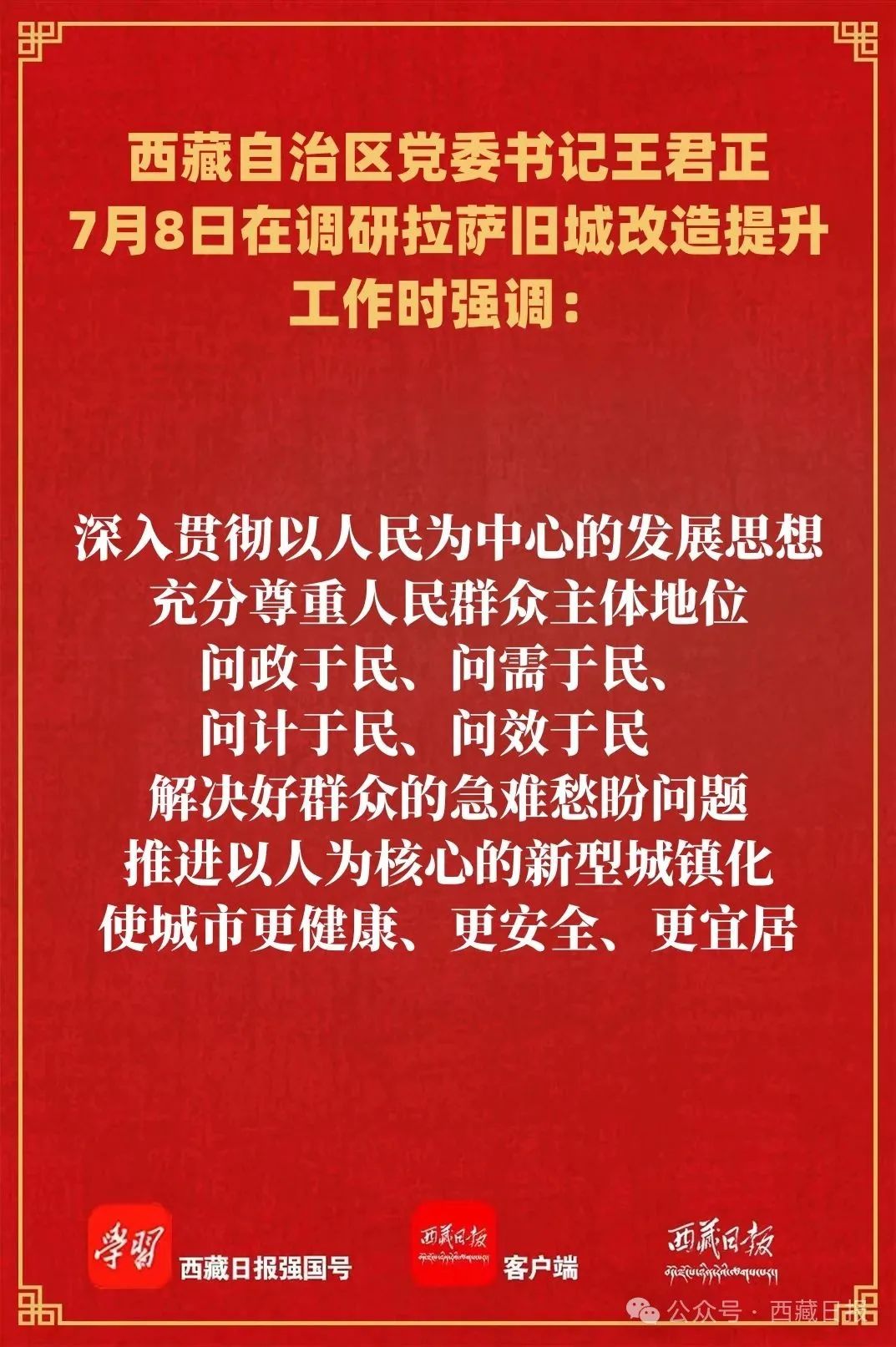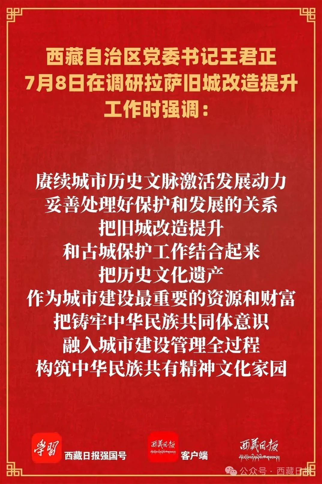 7月8日,自治區黨委書記王君正在調研拉薩舊城改造提升工作時強調,要認真貫徹落實習近平總書記關于城市工作、西藏工作的重要指示和新時代黨的治藏方略,堅持以人民為中心的發展思想,踐行人民城市理念,積極實施城市更新行動,扎實推進舊城改造提升,不斷增強各族群眾獲得感幸福感。