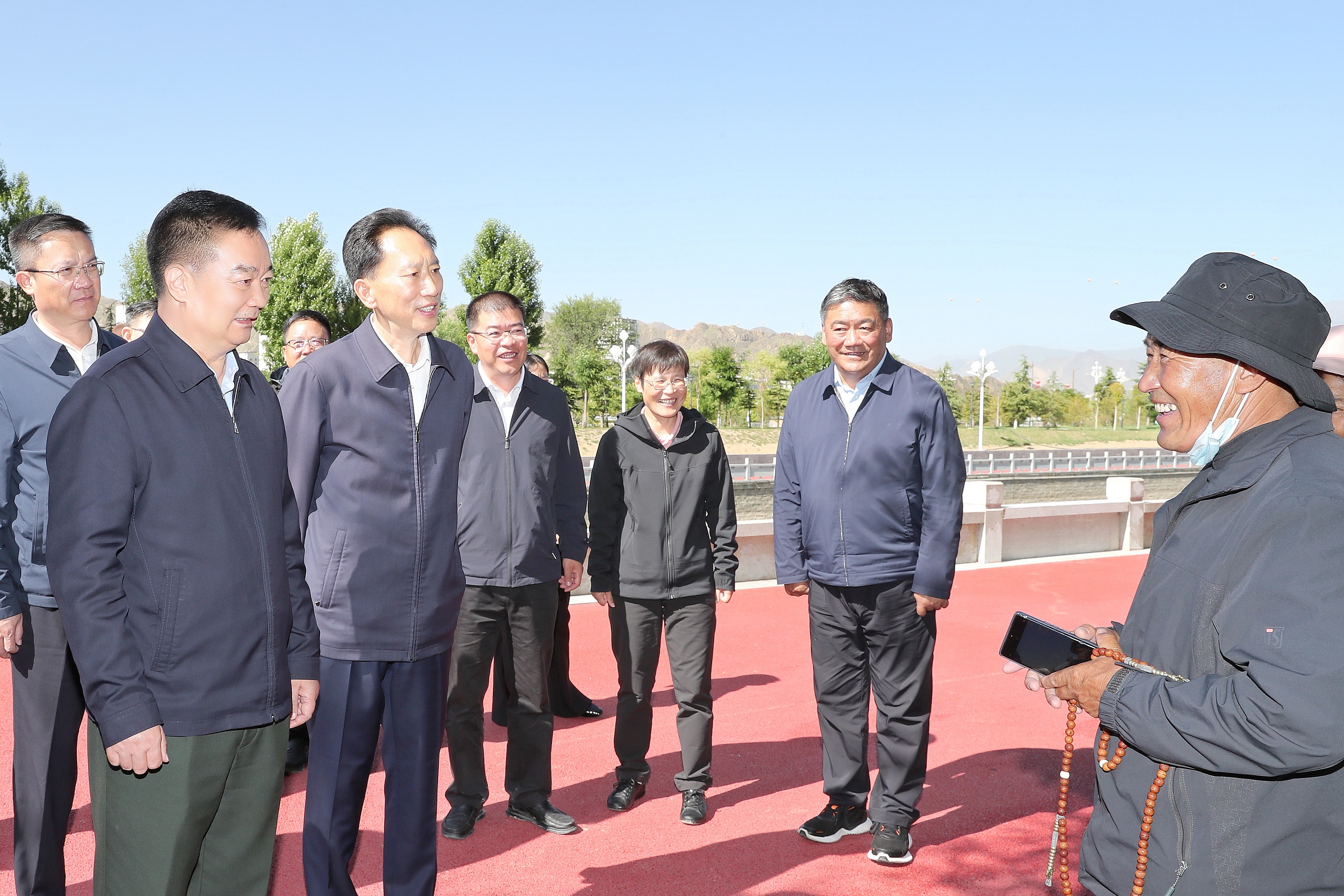7月8日,自治區黨委書記王君正調研拉薩舊城改造提升工作。這是王君正在拉薩河內河兩岸步行道調研時與群眾親切交談。記者 白瑪澤旺 攝