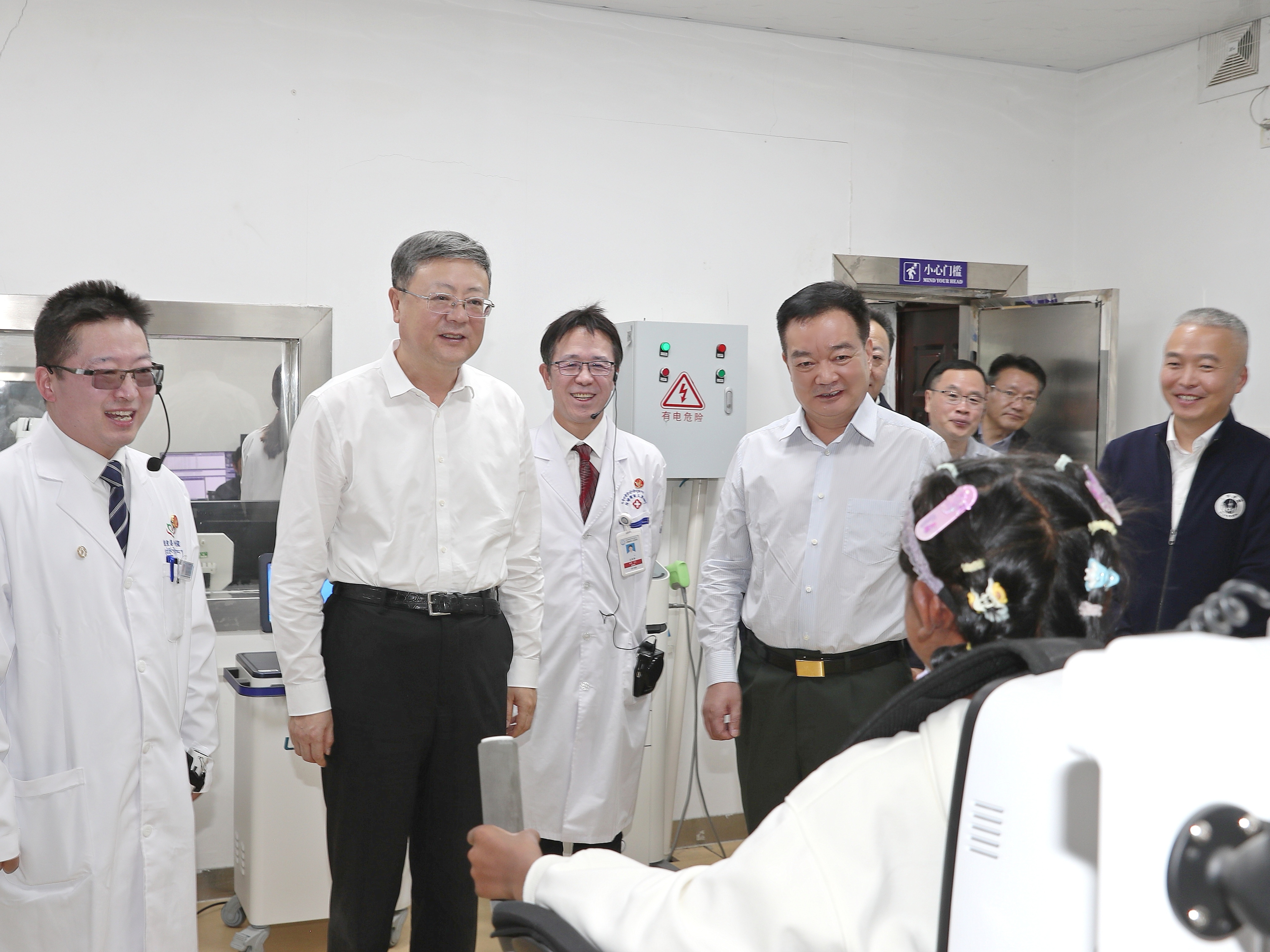 7月11日至12日,上海市代表團來藏考察。上海市委書記陳吉寧、自治區黨委書記王君正參加。這是陳吉寧和王君正來到日喀則市拉孜縣中心醫院,同正在進行康復訓練的13歲女孩達娃吉拉交談。記者 白瑪澤旺 攝