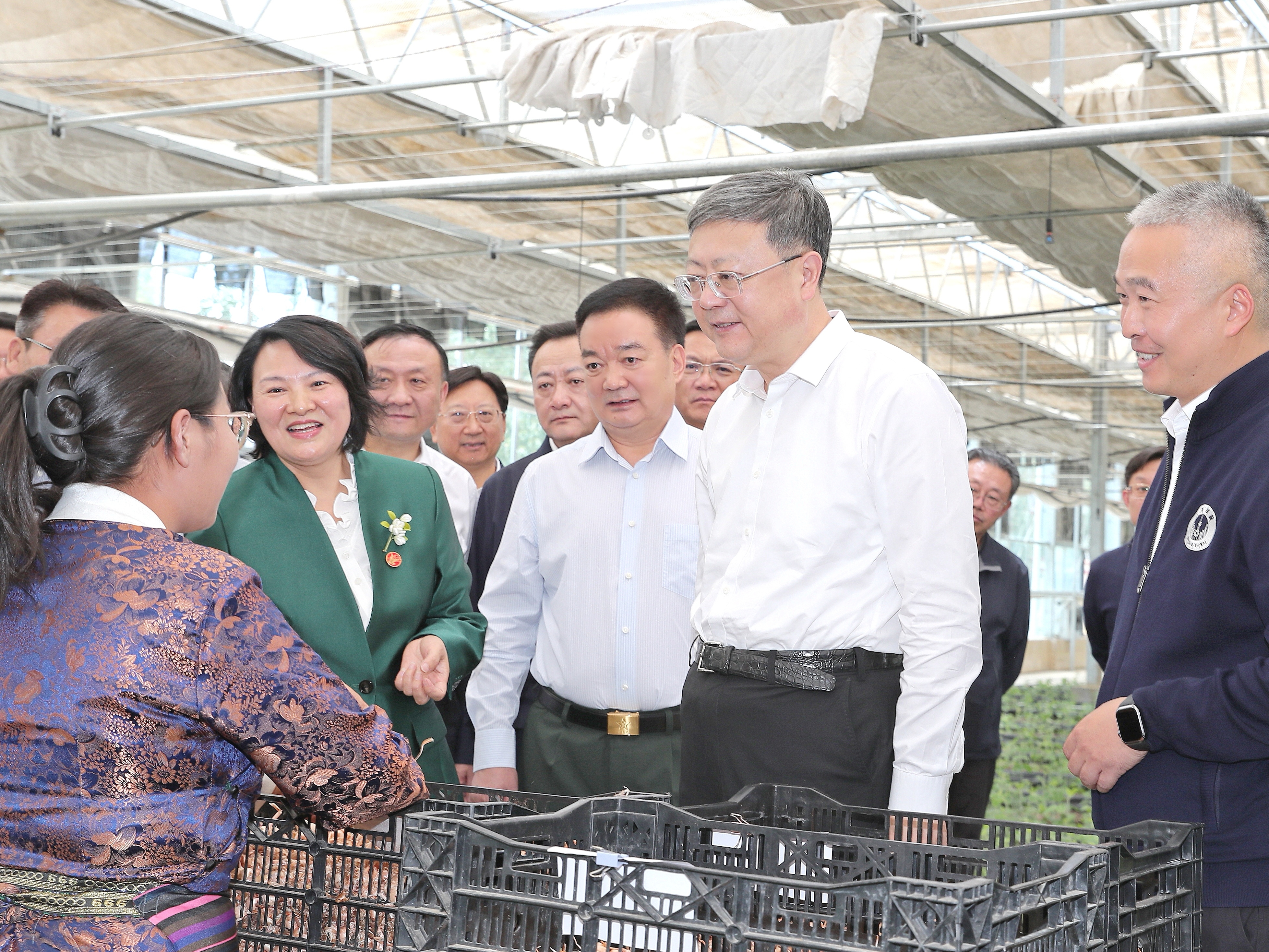 7月11日至12日,上海市代表團來藏考察。上海市委書記陳吉寧、自治區黨委書記王君正參加。這是陳吉寧和王君正來到日喀則市薩迦縣國家現代農業產業園,聽取情況介紹。記者 白瑪澤旺 攝