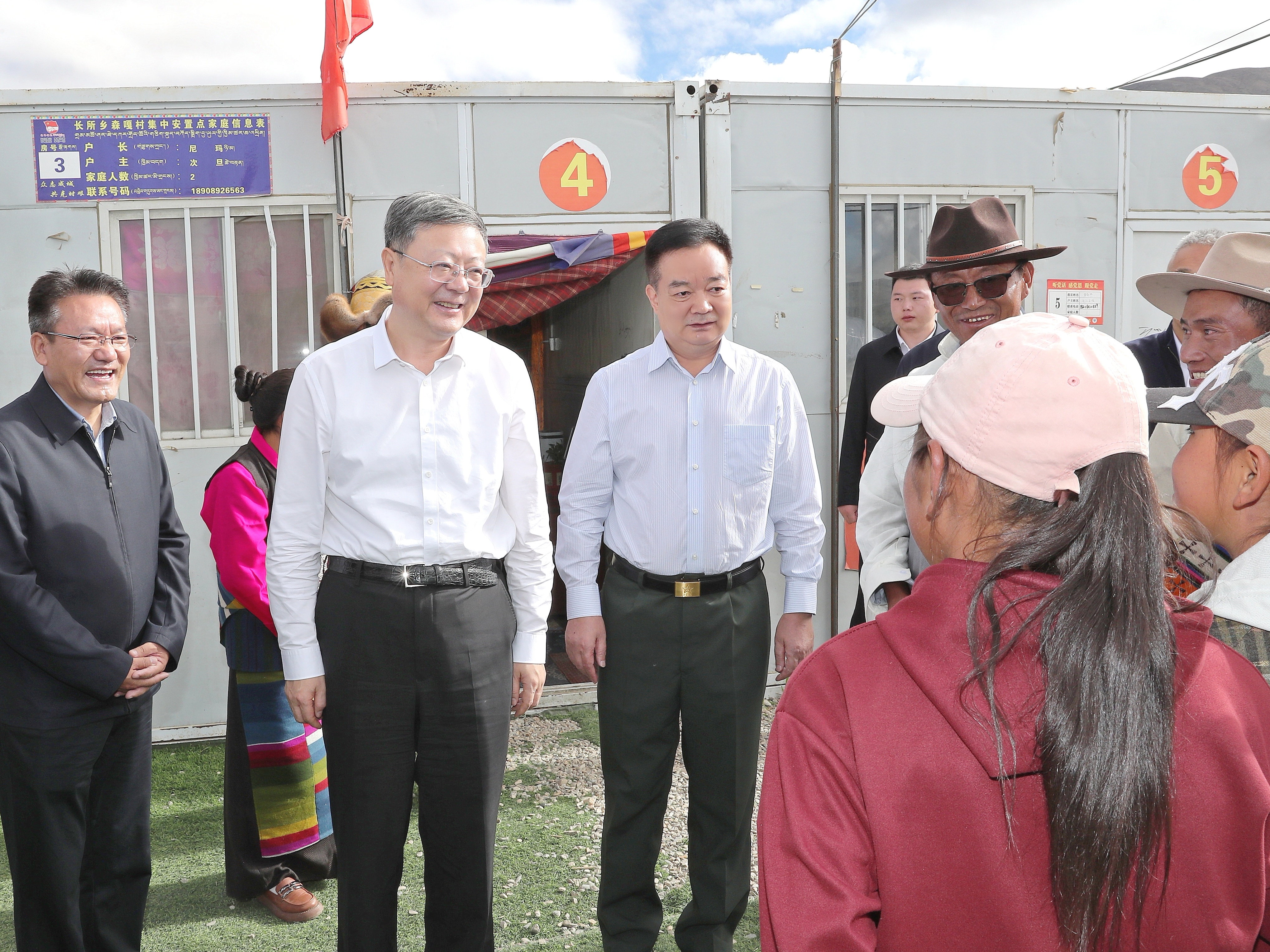 7月11日至12日,上海市代表團來藏考察。上海市委書記陳吉寧、自治區黨委書記王君正參加。這是陳吉寧和王君正來到日喀則市定日縣長所鄉森嘎村,看望慰問受災群眾,察看重建項目進展情況。記者 白瑪澤旺 攝