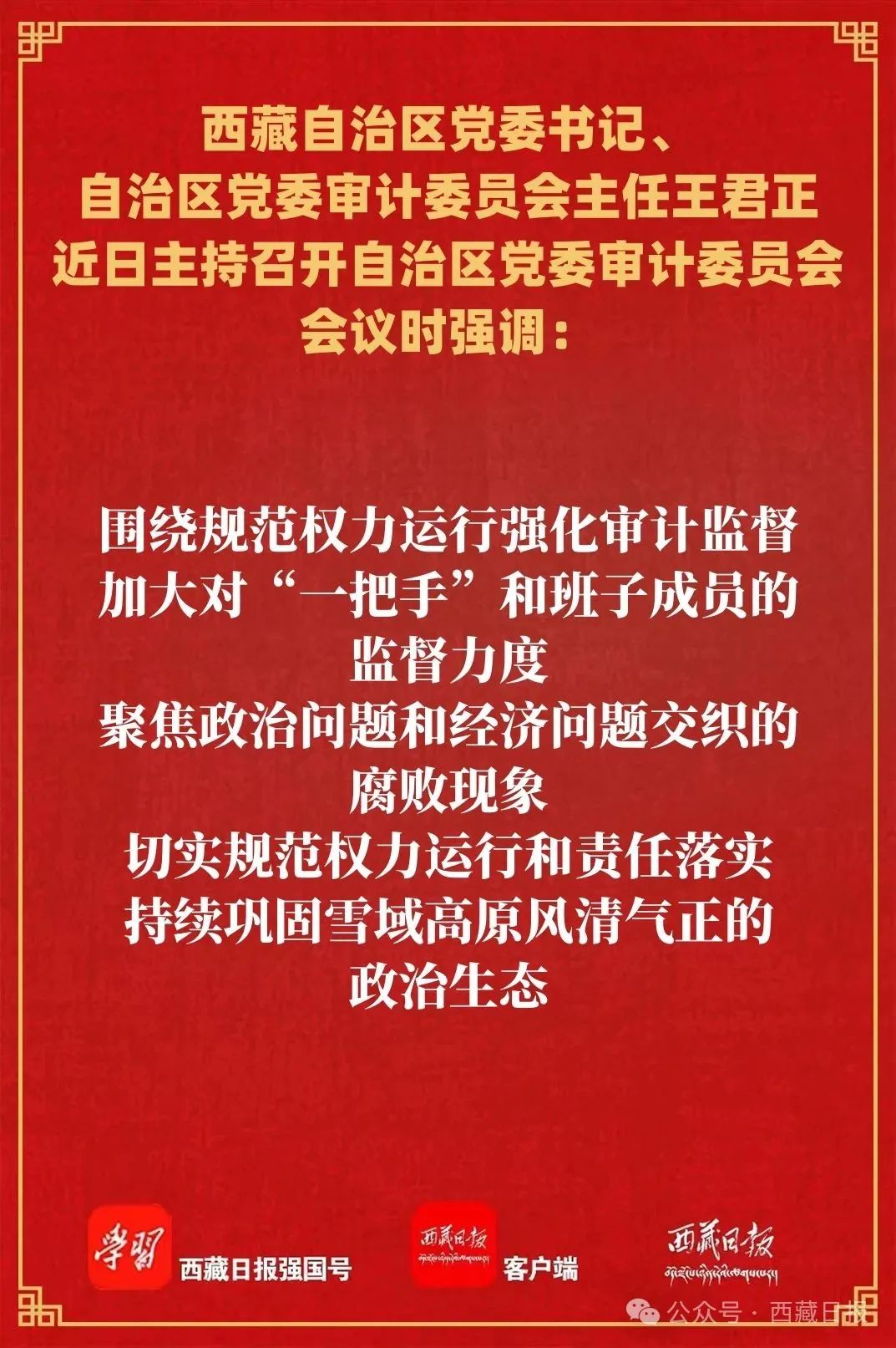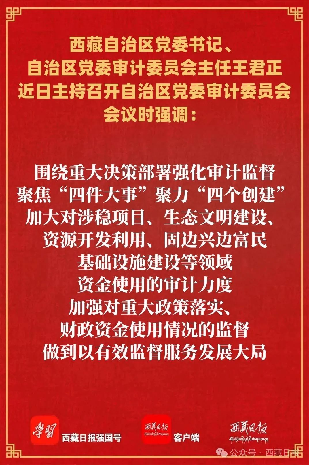 王君正強調,要圍繞中心、服務大局,以高質量審計服務保障西藏長治久安和高質量發展。圍繞重大決策部署強化審計監督,聚焦“四件大事”聚力“四個創建”,加大對涉穩項目、生態文明建設、資源開發利用、固邊興邊富民基礎設施建設等領域資金使用的審計力度,加強對重大政策落實、財政資金使用情況的監督,做到以有效監督服務發展大局。圍繞全面深化改革強化審計監督,著眼重點領域深化改革目標,及時反映改革措施不配套、不銜接、不落實等問題,一體推進揭示問題、規范管理、促進改革。圍繞保障和改善民生強化審計監督,緊盯民生資金分配使用的關鍵環節,全力做好幫扶項目資產管理等專項審計,維護社會公平正義,增進民生福祉。圍繞規范權力運行強化審計監督,加大對“一把手”和班子成員的監督力度,聚焦政治問題和經濟問題交織的腐敗現象,切實規范權力運行和責任落實,持續鞏固雪域高原風清氣正的政治生態。圍繞審計發現問題強化審計整改,嚴格落實整改主體責任,明確目標要求、整改措施、整改時限,明確具體責任單位和責任人,一項一項盯緊抓實,一件一件對賬銷號,推動審計發現問題整改落實落細落地;加強常態化督查督辦,進一步健全完善跟蹤督辦工作機制,對工作不力的及時約談通報,對失職瀆職的嚴肅問責,切實增強審計監督的針對性和嚴肅性;加強審計結果運用,舉一反三、標本兼治、建章立制,推動審計監督、整改、治理有機貫通,做到整改一個問題、完善一套制度、堵塞一批漏洞,切實提升審計監督實效。