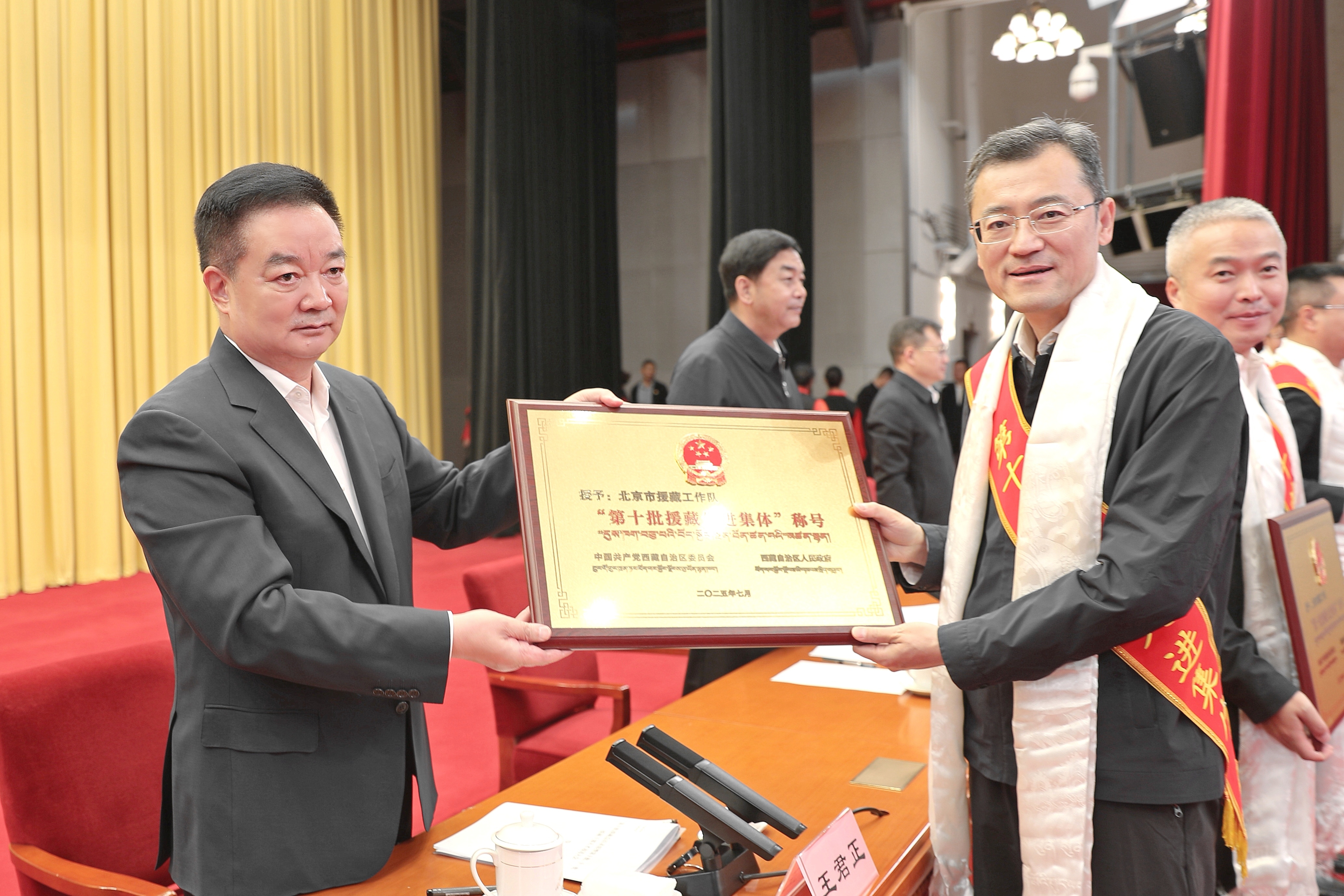 7月28日,全區第十批、第十一批援藏干部人才迎送大會在拉薩召開。自治區黨委書記王君正、中組部部務委員兼干部一局局長石軍出席并講話。這是王君正向受表彰先進集體頒獎。記者 白瑪澤旺 攝