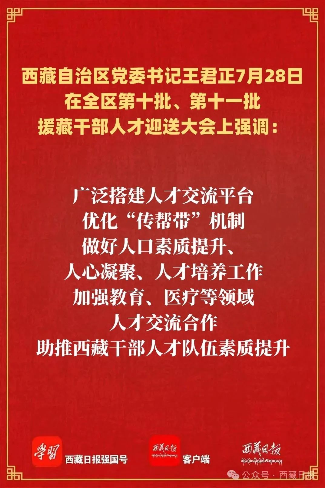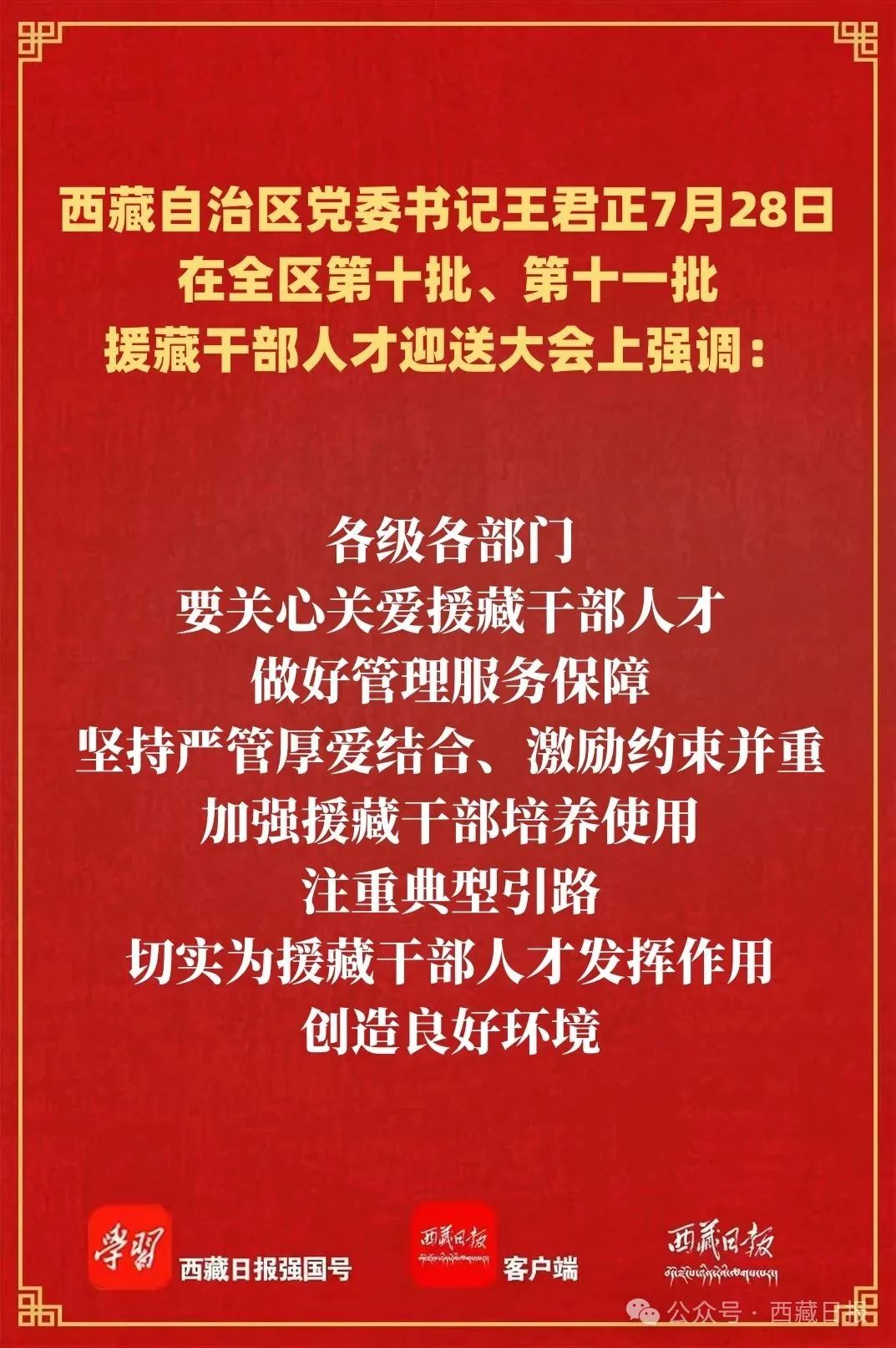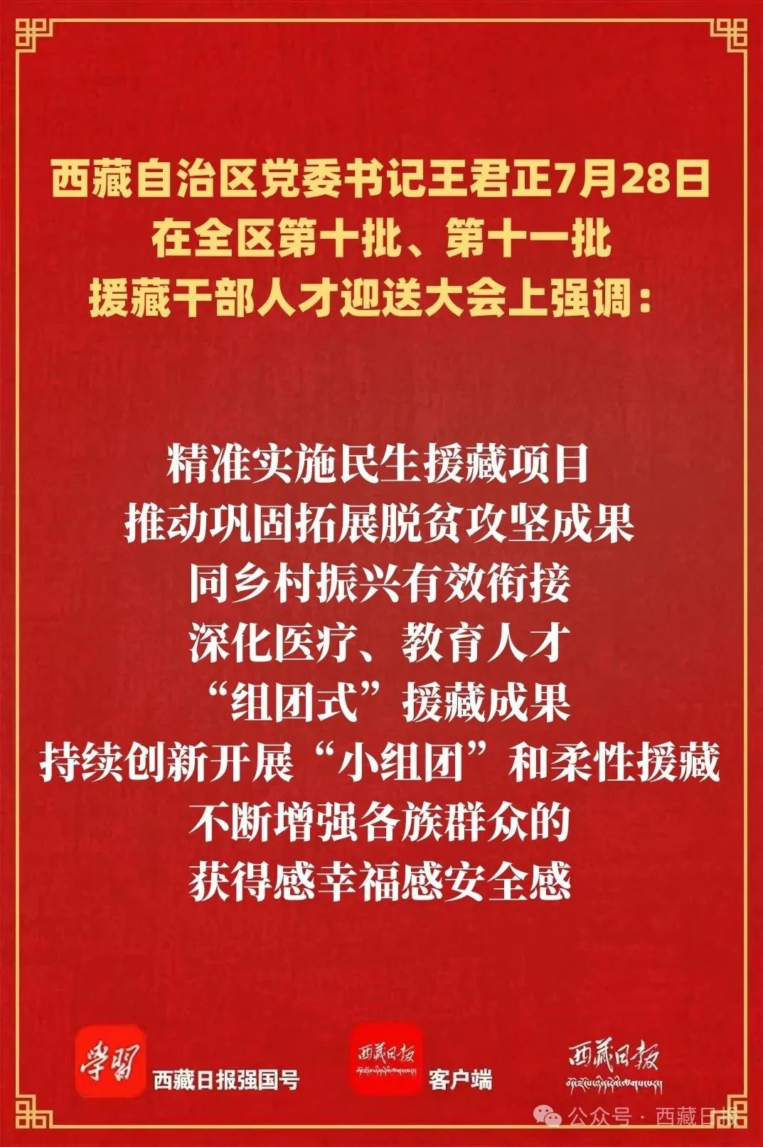 王君正強調,第十一批援藏干部人才要踐行援藏精神、強化使命擔當,推動新時代對口援藏事業高質量發展。深刻領悟“兩個確立”的決定性意義,深入學習貫徹習近平總書記關于西藏工作、援藏工作的重要指示和新時代黨的治藏方略,堅持從政治上看待和謀劃援藏工作,進一步增強責任感使命感,積極研究新情況、主動解決新問題、探索建立新機制,堅持系統觀念,正確把握援藏工作當前和長遠、全面與重點、援助與合作的關系,不斷提升對口援藏工作質效。深化維穩援藏,堅持警鐘長鳴、警惕常在,加大維穩基礎設施建設力度,充分運用援藏省市、部門的先進治理理念、治理模式、治理經驗,不斷提升社會治理體系和治理能力現代化水平,確保社會大局持續和諧穩定,打牢長治久安的基礎。深化經濟援藏,把“三個賦予一個有利于”總要求貫穿西藏經濟社會發展全過程,立足西藏實際,加強援藏省市和西藏資源互補、產業對接、市場共享,培育發展特色優勢產業,努力把資源優勢轉化為經濟優勢、發展優勢。深化民生援藏,精準實施民生援藏項目,推動鞏固拓展脫貧攻堅成果同鄉村振興有效銜接,深化醫療、教育人才“組團式”援藏成果,持續創新開展“小組團”和柔性援藏,不斷增強各族群眾的獲得感幸福感安全感。深化文化援藏,把鑄牢中華民族共同體意識、推進中華民族共同體建設作為主線,抓好文化浸潤工作,加強紅色文化和中華優秀傳統文化傳承弘揚,促進各民族廣泛交往、全面交流、深度交融,進一步構筑中華民族共有精神文化家園。深化智力援藏,廣泛搭建人才交流平臺,優化“傳幫帶”機制,做好人口素質提升、人心凝聚、人才培養工作,加強教育、醫療等領域人才交流合作,助推西藏干部人才隊伍素質提升。