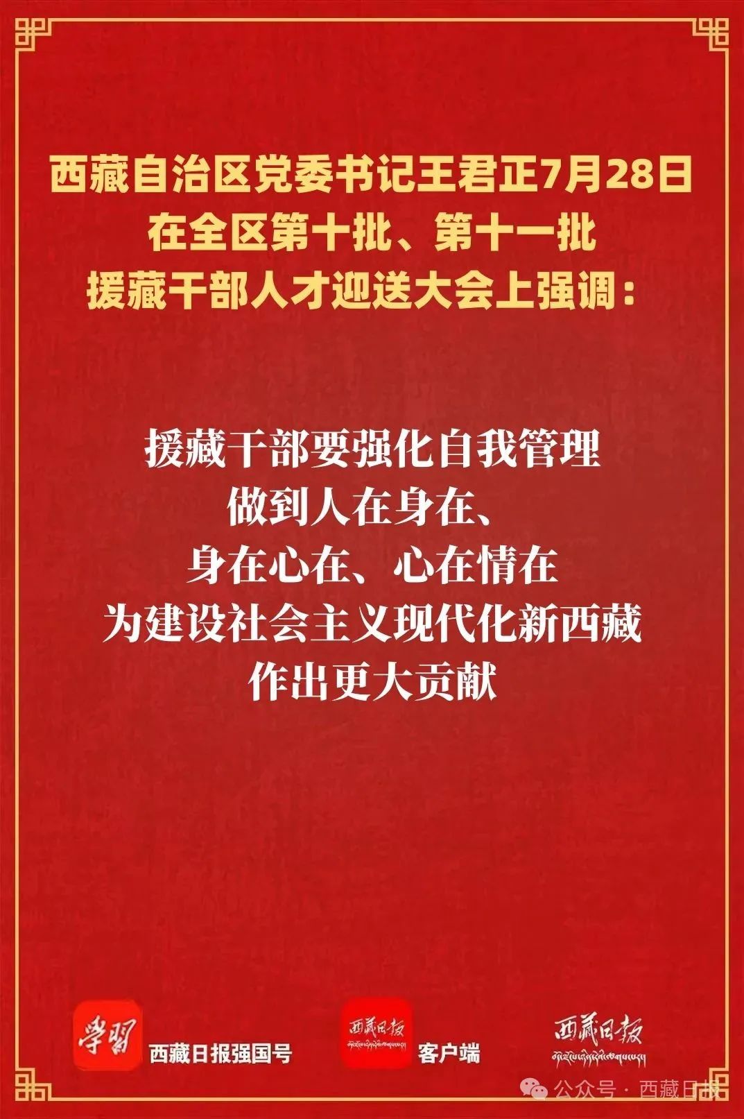 王君正強調,各級各部門要關心關愛援藏干部人才,做好管理服務保障,堅持嚴管厚愛結合、激勵約束并重,加強援藏干部培養使用,注重典型引路,切實為援藏干部人才發揮作用創造良好環境。援藏干部要強化自我管理,做到人在身在、身在心在、心在情在,為建設社會主義現代化新西藏作出更大貢獻。