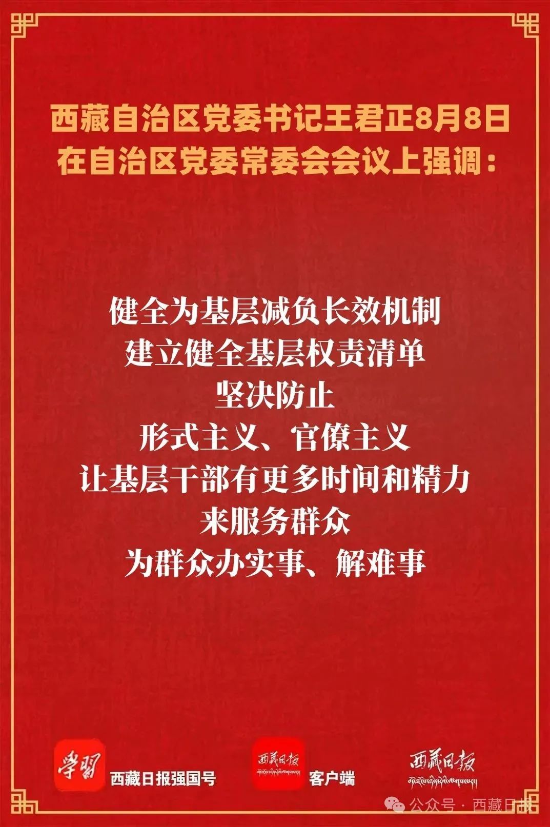 王君正強調,要落實政治責任,為推動西藏長治久安和高質量發展提供堅強保障。加強黨的建設,各級黨組織要堅決扛起全面從嚴治黨政治責任,樹立正確選人用人導向,引導廣大干部踐行正確政績觀,提振干事創業精氣神。不斷提升工作能力,各級領導干部要主動適應形勢發展需要,加強現代經濟知識和社會主義市場經濟知識學習,立足全局把握經濟發展規律,統籌研究經濟和社會發展問題,努力成為經濟工作的內行。改進作風狠抓落實,認真總結開展深入貫徹中央八項規定精神學習教育成果,加強轉化運用,提升執行力,確保各項工作落到實處、取得實效。持續為基層減負賦能,認真學習貫徹中共中央辦公廳、國務院辦公廳印發的《整治形式主義為基層減負若干規定》,健全為基層減負長效機制,建立健全基層權責清單,堅決防止形式主義、官僚主義,讓基層干部有更多時間和精力來服務群眾,為群眾辦實事、解難事。
