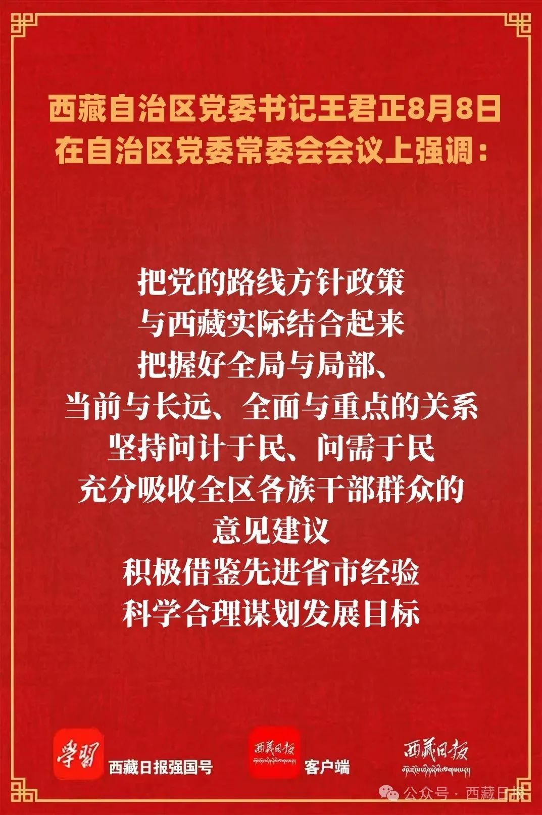 會議傳達學習了習近平總書記在7月30日中央政治局會議、7月23日黨外人士座談會上的重要講話精神,就研究吸收網民對“十五五”規劃編制工作意見建議作出的重要指示精神,向世界青年和平大會的重要致信精神。王君正指出,習近平總書記的重要講話,統籌國內國際兩個大局,全面分析了當前和今后一個時期國內國際形勢,實事求是總結了今年上半年經濟工作,深刻闡明了下半年經濟工作和“十五五”時期經濟社會發展的總體要求、政策取向、重點任務,為我們做好西藏工作指明了前進方向、提供了根本遵循。全區各級各部門要提高政治站位,深刻領悟“兩個確立”的決定性意義,增強“四個意識”、堅定“四個自信”、做到“兩個維護”,切實把思想和行動統一到習近平總書記重要講話精神上來,求真務實、真抓實干,努力推動西藏經濟社會高質量發展。