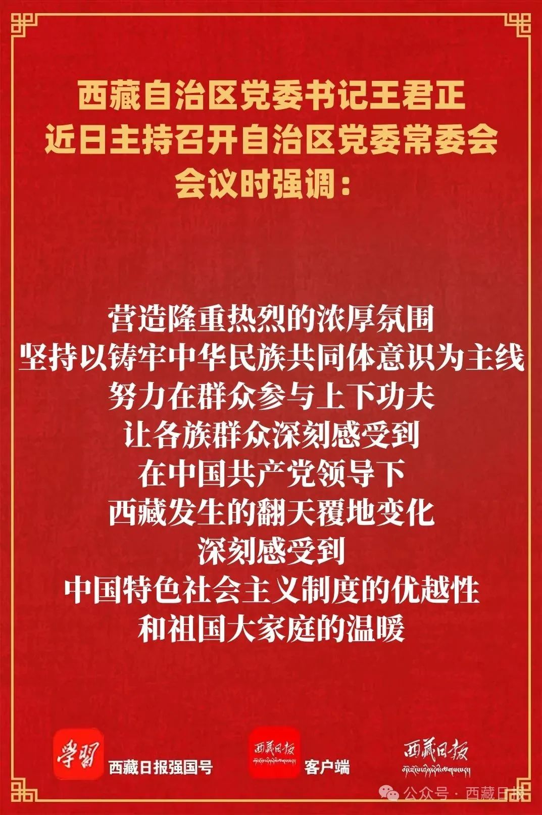 王君正指出,自治區(qū)成立60周年慶祝活動(dòng),是全區(qū)各族人民政治生活中的一件大事喜事盛事,對(duì)充分展示在黨的領(lǐng)導(dǎo)下西藏自治區(qū)成立60年來(lái)特別是黨的十八大以來(lái)取得的全方位進(jìn)步、歷史性成就,充分展現(xiàn)習(xí)近平總書記關(guān)于西藏工作的重要指示和新時(shí)代黨的治藏方略在西藏的生動(dòng)實(shí)踐,充分彰顯黨的領(lǐng)導(dǎo)政治優(yōu)勢(shì)和中國(guó)特色社會(huì)主義制度的優(yōu)越性,進(jìn)一步宣傳引導(dǎo)全區(qū)各族干部群眾聽黨話、感黨恩、跟黨走,推進(jìn)西藏長(zhǎng)治久安和高質(zhì)量發(fā)展,具有十分重大的意義。