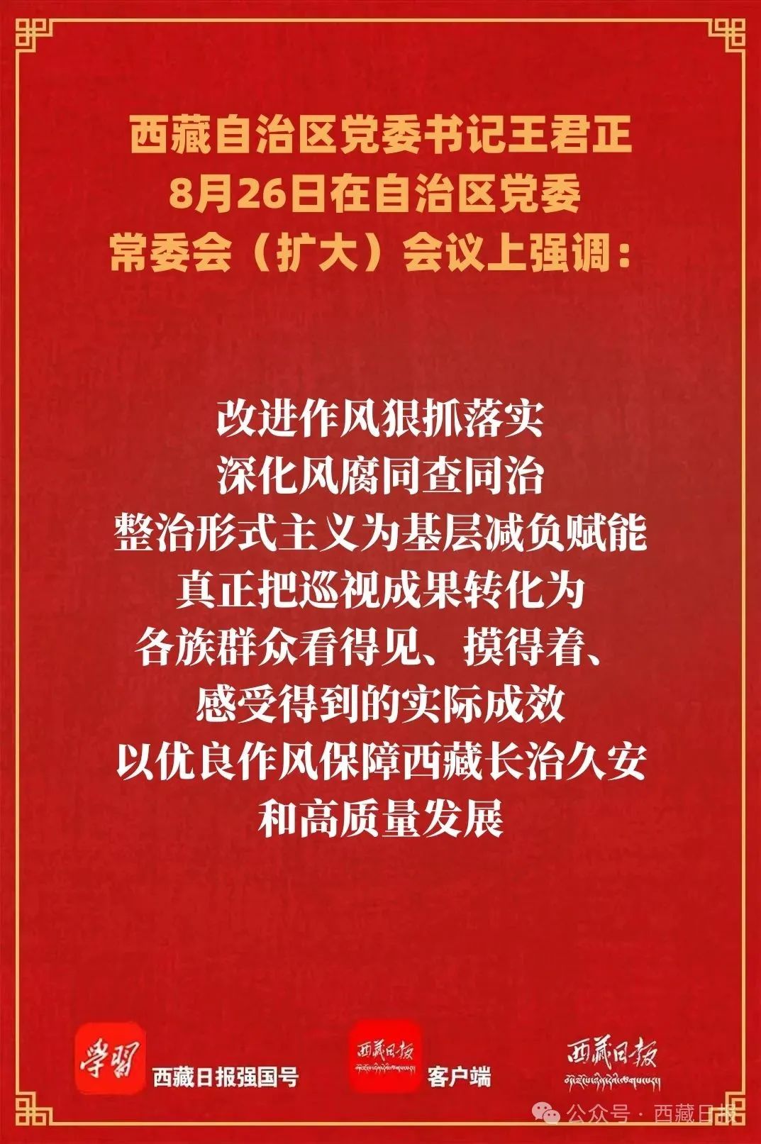 王君正強調,要堅持系統觀念,強化綜合監督,進一步健全巡視工作格局。深化上下聯動,自治區黨委巡視機構要加強工作指導,各級黨委要壓實工作責任、健全工作機制、完善責任體系,抓好整改落實和成果運用,著力解決人民群眾急難愁盼問題。強化橫向貫通,深化巡視與督查、紀檢監察和組織監督的貫通協同,運用審計、財政、統計等部門的專業力量和監督成果,加強與政法、信訪等部門的協作配合,形成監督合力,提升工作質效。做好結合融合,把巡視工作與深入貫徹中央八項規定精神學習教育結合起來,改進作風狠抓落實,深化風腐同查同治,整治形式主義為基層減負賦能,真正把巡視成果轉化為各族群眾看得見、摸得著、感受得到的實際成效,以優良作風保障西藏長治久安和高質量發展。