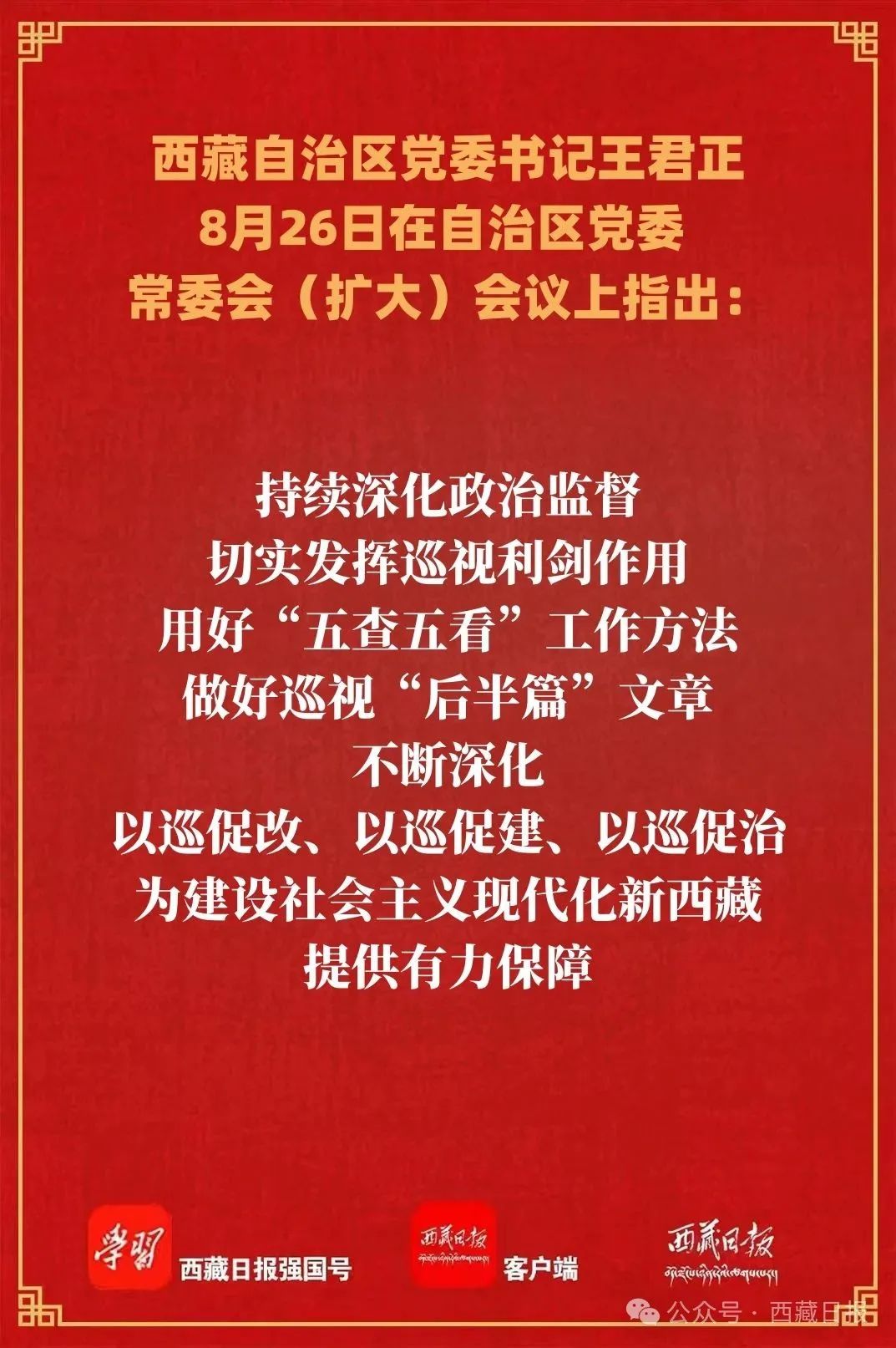 王君正指出,黨的十八大以來,以習近平同志為核心的黨中央高度重視巡視工作,習近平總書記親自謀劃、親自部署、親自推動巡視工作,發表一系列重要講話,作出一系列重要指示,為我們做好巡視工作指明了前進方向、提供了根本遵循。全區各級各部門要深刻領悟“兩個確立”的決定性意義,增強“四個意識”、堅定“四個自信”、做到“兩個維護”,深入學習貫徹習近平總書記關于巡視工作的重要論述,堅守政治巡視定位,圍繞中心服務大局,持續深化政治監督,切實發揮巡視利劍作用,用好“五查五看”工作方法,做好巡視“后半篇”文章,不斷深化以巡促改、以巡促建、以巡促治,為建設社會主義現代化新西藏提供有力保障。