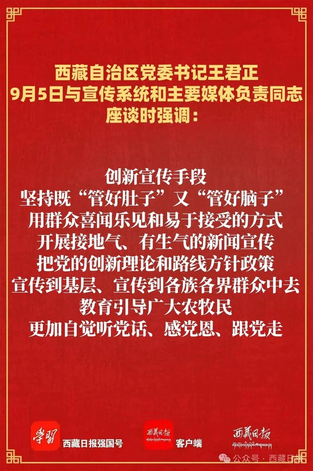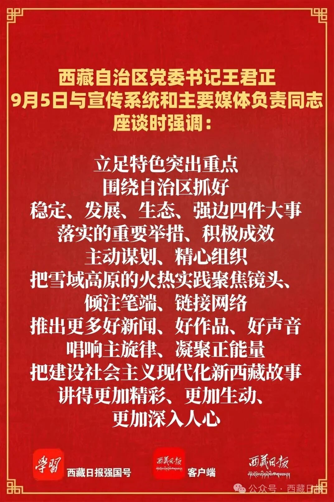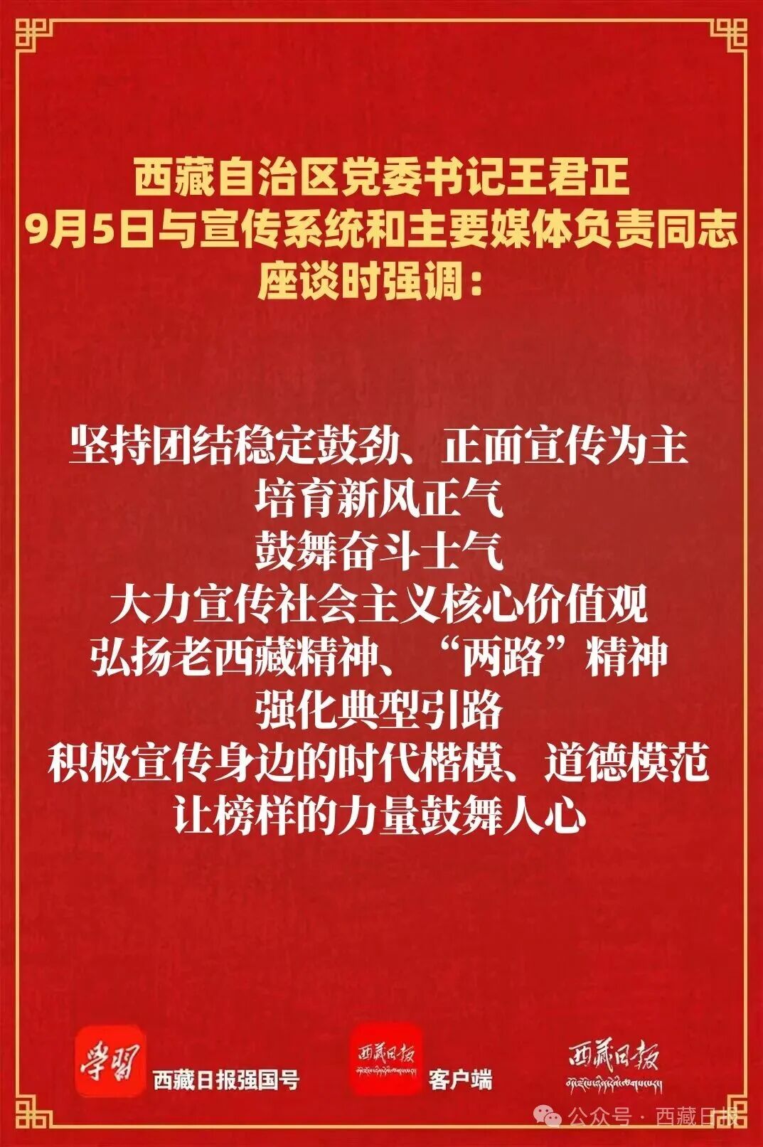 9月5日,自治區黨委書記王君正與宣傳系統和主要媒體負責同志座談。他強調,要堅持以習近平新時代中國特色社會主義思想為指導,弘揚正能量、傳播好聲音,講好新時代西藏故事,為加快建設社會主義現代化新西藏營造良好社會氛圍。