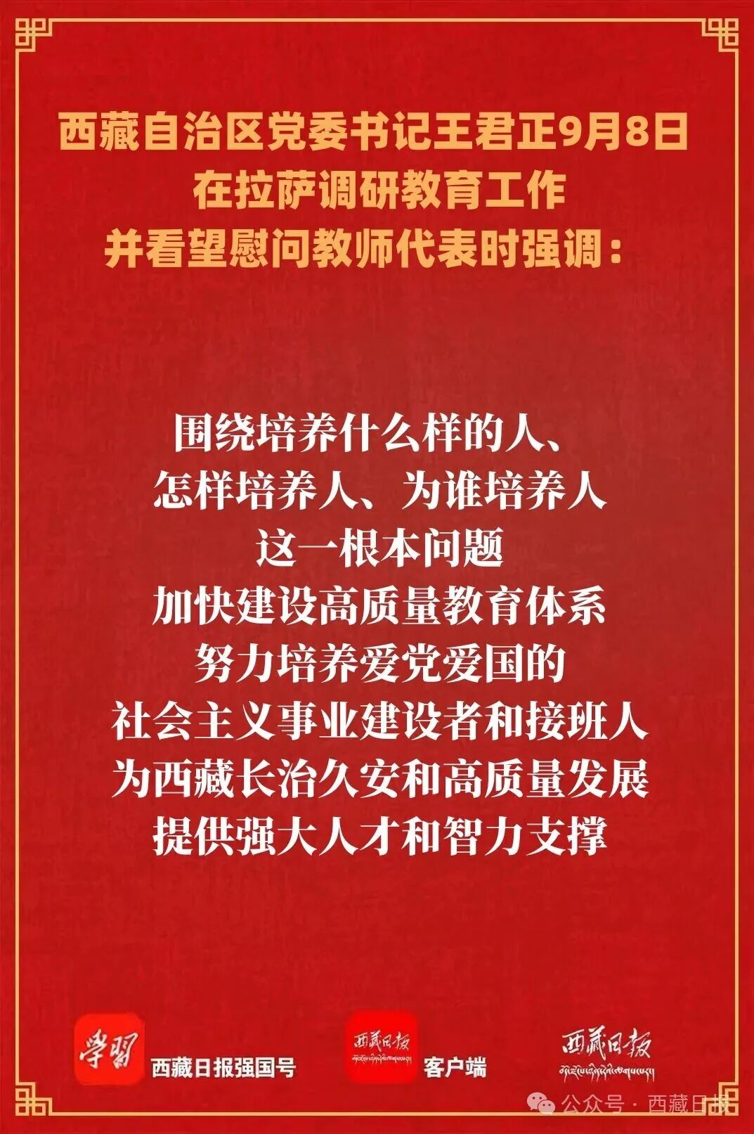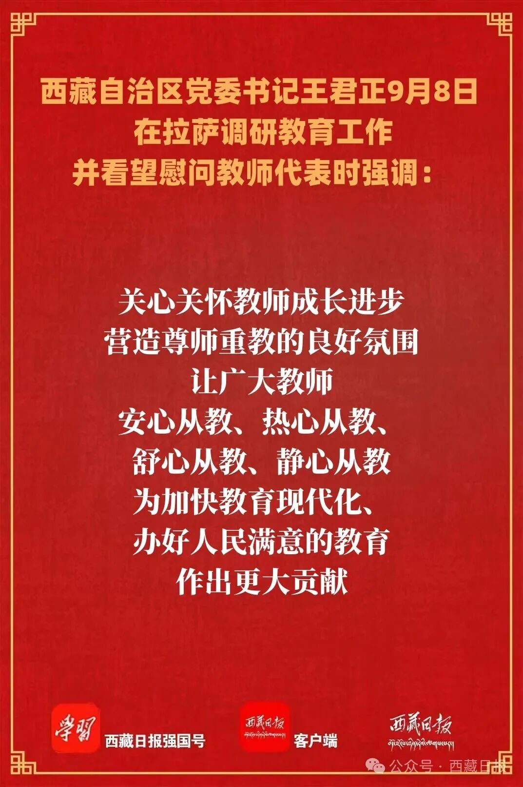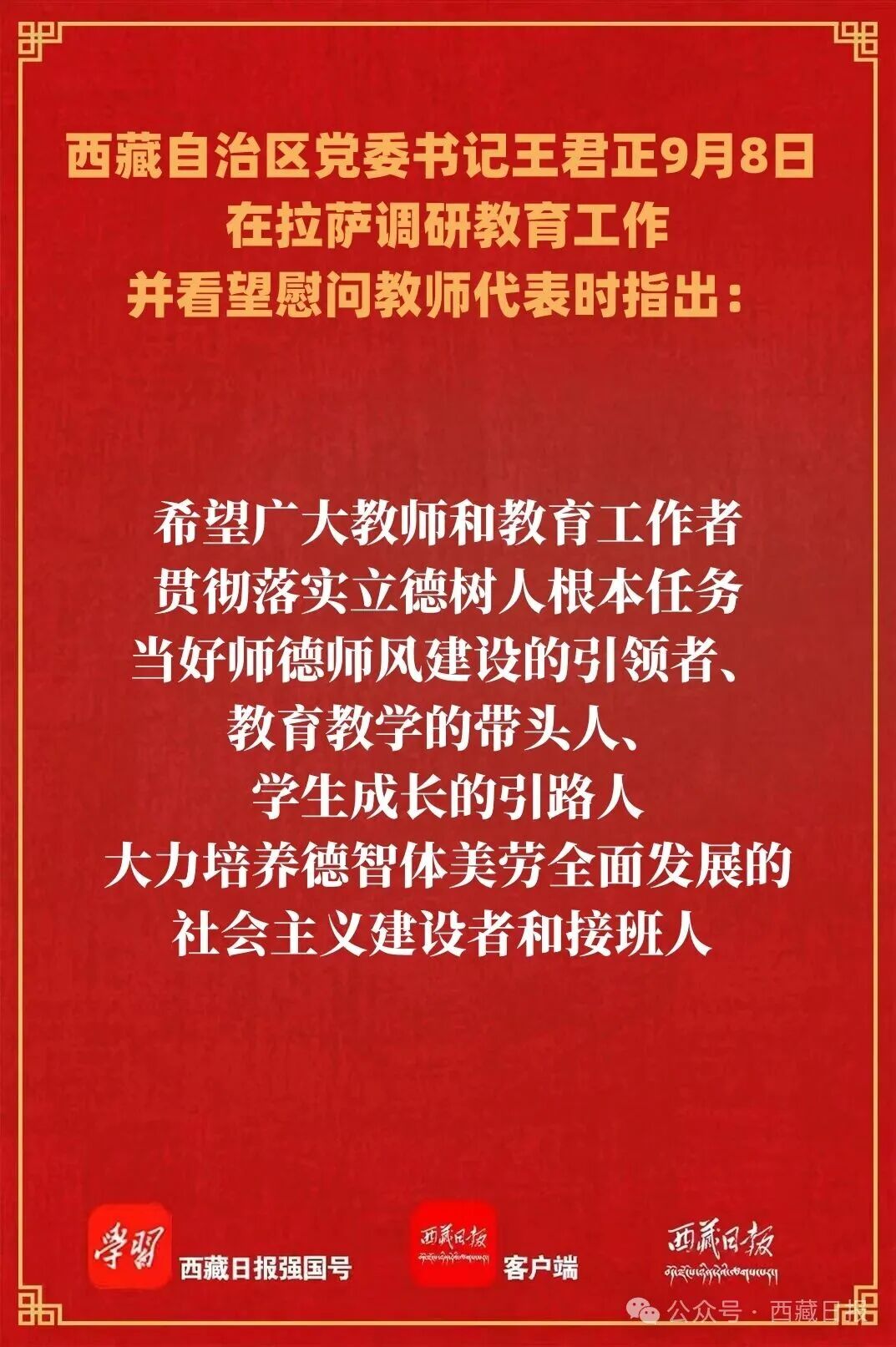在第41個教師節(jié)即將來臨之際,自治區(qū)黨委書記王君正9月8日在拉薩調(diào)研教育工作并看望慰問教師代表,代表自治區(qū)黨委、政府向全區(qū)廣大教師、教育工作者致以節(jié)日的祝福和誠摯的慰問。他強(qiáng)調(diào),要認(rèn)真學(xué)習(xí)貫徹習(xí)近平總書記關(guān)于教育、西藏工作的重要指示,全面貫徹黨的教育方針,落實(shí)立德樹人根本任務(wù),努力培養(yǎng)德智體美勞全面發(fā)展的社會主義建設(shè)者和接班人,為共建中華民族共同體、書寫美麗西藏新篇章作出更大貢獻(xiàn)。