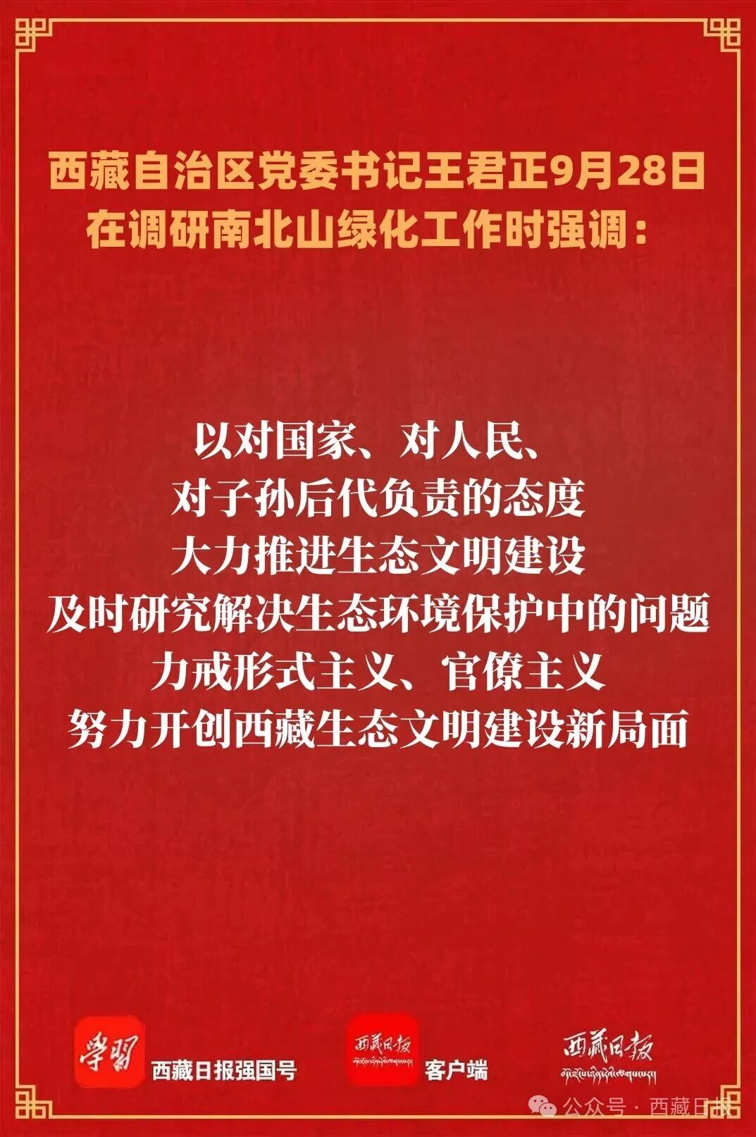 王君正強(qiáng)調(diào),各級(jí)黨委要切實(shí)擔(dān)負(fù)起生態(tài)文明建設(shè)的政治責(zé)任,嚴(yán)格落實(shí)生態(tài)環(huán)境保護(hù)“黨政同責(zé)、一崗雙責(zé)”,以對(duì)國家、對(duì)人民、對(duì)子孫后代負(fù)責(zé)的態(tài)度,大力推進(jìn)生態(tài)文明建設(shè),及時(shí)研究解決生態(tài)環(huán)境保護(hù)中的問題,力戒形式主義、官僚主義,努力開創(chuàng)西藏生態(tài)文明建設(shè)新局面。