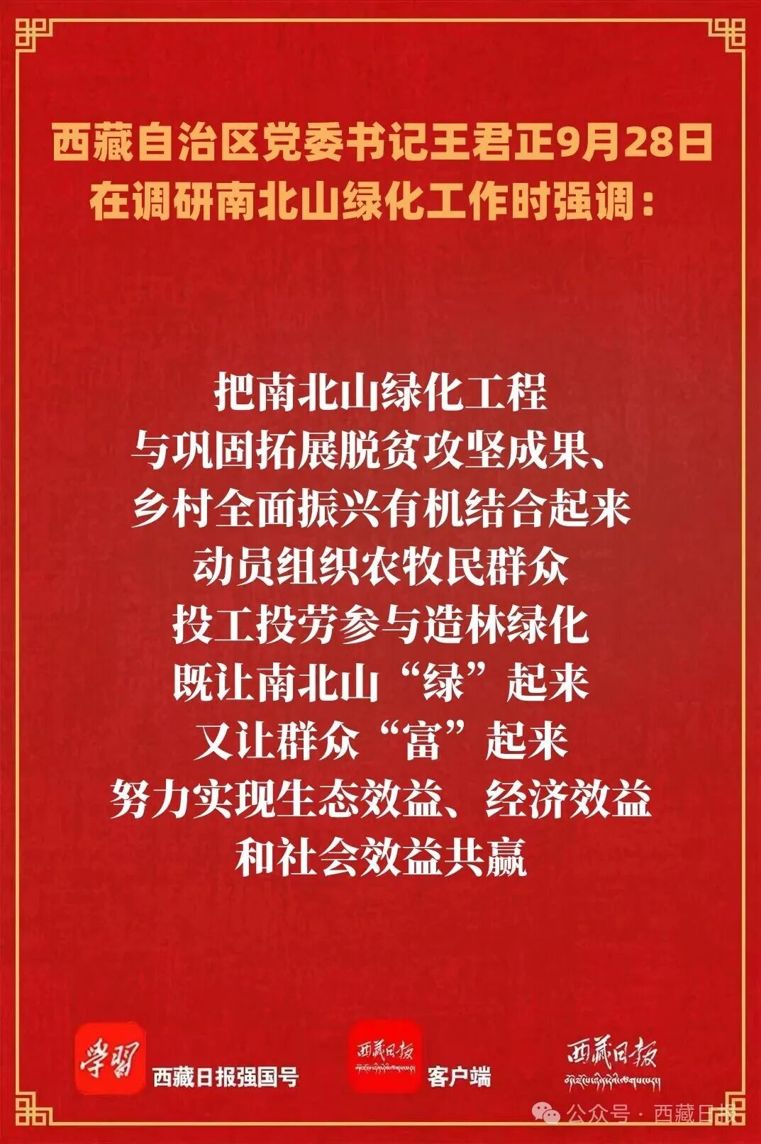 王君正強(qiáng)調(diào),要深入貫徹落實(shí)習(xí)近平生態(tài)文明思想,扎實(shí)推進(jìn)國家生態(tài)文明高地創(chuàng)建,加快美麗西藏建設(shè)。深刻認(rèn)識(shí)西藏最大的價(jià)值在生態(tài)、最大的責(zé)任在生態(tài)、最大的潛力也在生態(tài),正確把握生態(tài)安全和發(fā)展安全、經(jīng)濟(jì)建設(shè)和生態(tài)文明建設(shè)、社會(huì)建設(shè)和生態(tài)文明建設(shè)、繼承傳統(tǒng)和創(chuàng)新發(fā)展的關(guān)系,把保護(hù)生態(tài)環(huán)境作為一切發(fā)展的前提和基礎(chǔ),努力實(shí)現(xiàn)在保護(hù)中加快高質(zhì)量發(fā)展、在發(fā)展中實(shí)現(xiàn)更高水平的保護(hù)。要以法治思維、法治方式加強(qiáng)生態(tài)環(huán)境保護(hù),認(rèn)真落實(shí)青藏高原生態(tài)保護(hù)法及自治區(qū)環(huán)境保護(hù)條例,堅(jiān)決防止“兩高一低”企業(yè)和項(xiàng)目上青藏高原,“零容忍”打擊生態(tài)環(huán)境違法犯罪行為,提升生態(tài)文明建設(shè)法治化水平,切實(shí)守護(hù)好雪域高原的生靈草木、萬水千山。要科學(xué)開展南北山綠化工程,準(zhǔn)確把握國土綠化行動(dòng)的新形勢和新要求,遵循“適地適樹”原則,加強(qiáng)苗木選育、管護(hù)巡查等全過程監(jiān)管,把成活率作為衡量造林成效的硬指標(biāo)和重要依據(jù),堅(jiān)持向科技要?jiǎng)幽堋⒁剩瑯?gòu)建數(shù)字化、智慧化監(jiān)管網(wǎng)絡(luò),持續(xù)推動(dòng)南北山綠化工作高質(zhì)量開展。要把“不斷滿足人民對(duì)美好生活的向往”作為工作出發(fā)點(diǎn)和落腳點(diǎn),堅(jiān)持綠化為了人民、綠化依靠人民、綠化成果由人民共享,把南北山綠化工程與鞏固拓展脫貧攻堅(jiān)成果、鄉(xiāng)村全面振興有機(jī)結(jié)合起來,動(dòng)員組織農(nóng)牧民群眾投工投勞參與造林綠化,既讓南北山“綠”起來,又讓群眾“富”起來,努力實(shí)現(xiàn)生態(tài)效益、經(jīng)濟(jì)效益和社會(huì)效益共贏。引導(dǎo)全社會(huì)樹立生態(tài)文明理念,總結(jié)經(jīng)驗(yàn)、鞏固成果,將行之有效的好做法上升為制度機(jī)制,講好新時(shí)代西藏造林故事,凝聚全民力量書寫美麗西藏新篇章。
