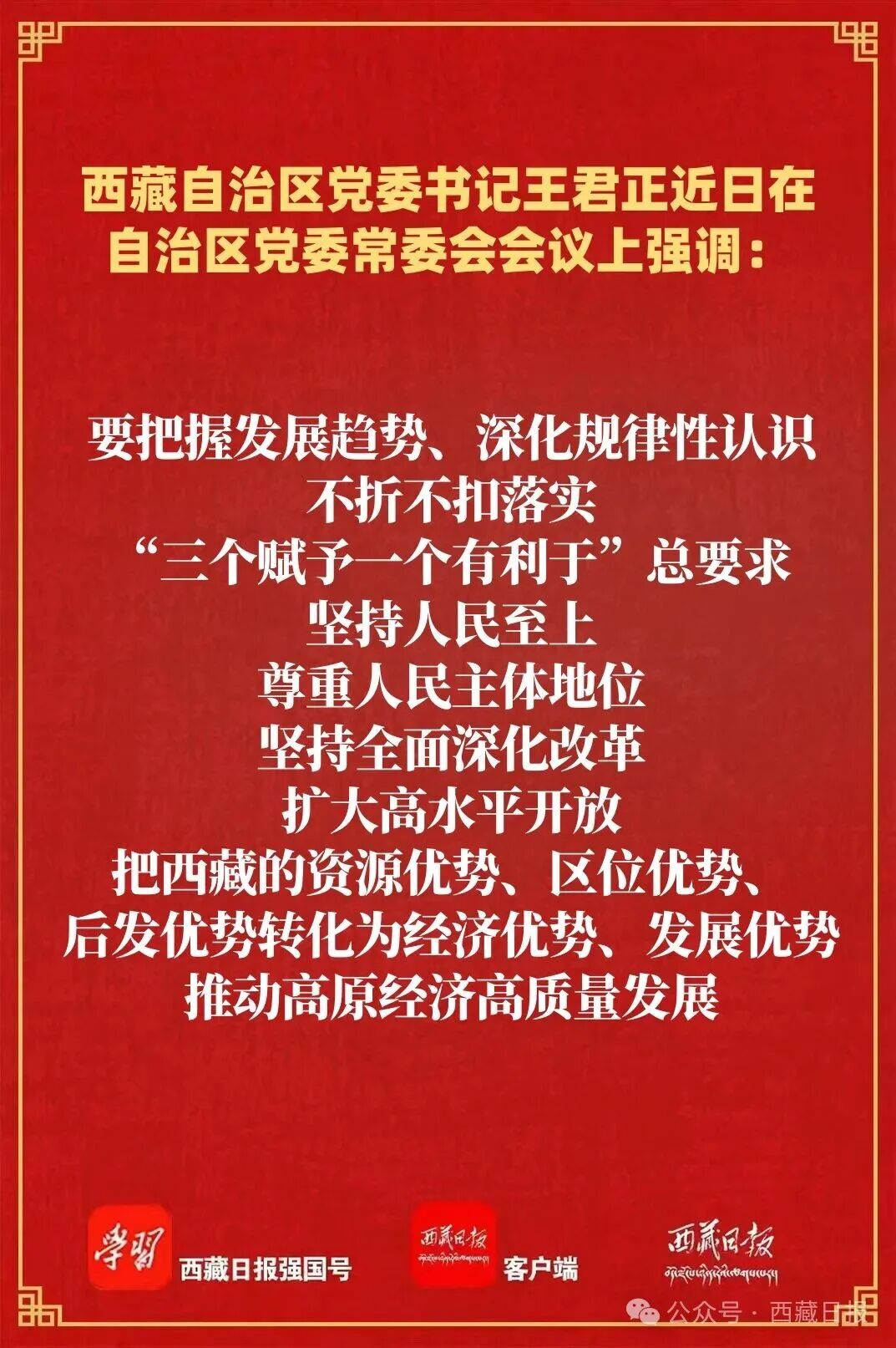 王君正強調,“十五五”時期是西藏經濟社會發展的重大機遇期。全區各級各部門要深入學習習近平總書記關于規劃編制、西藏工作的重要指示精神,自覺把西藏工作置于黨和國家工作大局中思考研究、謀劃推動,完整準確全面貫徹新發展理念,搶抓西部大開發戰略機遇,加強同國家部委溝通銜接,高質量完成“十五五”規劃編制,為西藏未來發展打下堅實基礎。要把握發展趨勢、深化規律性認識,不折不扣落實“三個賦予一個有利于”總要求,堅持人民至上,尊重人民主體地位,堅持全面深化改革,擴大高水平開放,把西藏的資源優勢、區位優勢、后發優勢轉化為經濟優勢、發展優勢,推動高原經濟高質量發展。