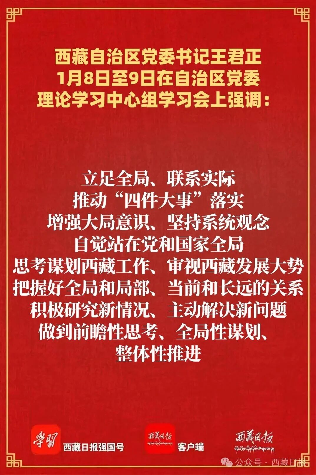 王君正強調(diào),要堅持以習近平新時代中國特色社會主義思想武裝頭腦、指導實踐、推動工作,更加深刻領(lǐng)悟“兩個確立”的決定性意義,堅決做到“兩個維護”。旗幟鮮明講政治,把對以習近平同志為核心的黨中央的絕對忠誠落實到思想上政治上行動上,不斷提高政治判斷力、政治領(lǐng)悟力、政治執(zhí)行力,始終做政治上的明白人。堅守立身之本,堅持不懈用習近平新時代中國特色社會主義思想凝心鑄魂,真學真懂、真信真用,自覺做馬克思主義的篤信篤行者。強化政治擔當,堅持用黨的創(chuàng)新理論統(tǒng)攬西藏工作全局,把握西藏工作內(nèi)在規(guī)律,把準治藏穩(wěn)藏興藏脈絡(luò),持之以恒推動“四件大事”落實。全區(qū)各級黨組織和廣大黨員干部要認真學習領(lǐng)會、主動對標對表,精心組織安排,做好各項準備,高質(zhì)量開好民主生活會、組織生活會,以新氣象、新作為確保“十五五”開好局、起好步。