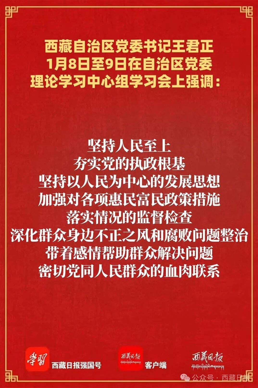 王君正強調(diào),要弘揚理論聯(lián)系實際的學風,恪盡職守、努力工作,以求真務(wù)實的精神推動社會主義現(xiàn)代化新西藏建設(shè)。不斷提高政治站位,確保黨中央政令暢通。堅持“第一議題”抓學習、“第一遵循”抓貫徹、“第一政治要件”抓落實,嚴明政治紀律和政治規(guī)矩,做到黨中央提倡的堅決響應(yīng)、黨中央決定的堅決執(zhí)行、黨中央禁止的堅決不做,扎實抓好中央巡視反饋意見整改,及時組織“回頭看”,確保西藏各項工作始終沿著習近平總書記指引的方向前進。堅持人民至上,夯實黨的執(zhí)政根基。堅持以人民為中心的發(fā)展思想,加強對各項惠民富民政策措施落實情況的監(jiān)督檢查,深化群眾身邊不正之風和腐敗問題整治,帶著感情幫助群眾解決問題,密切黨同人民群眾的血肉聯(lián)系。立足全局、聯(lián)系實際,推動“四件大事”落實。增強大局意識、堅持系統(tǒng)觀念,自覺站在黨和國家全局思考謀劃西藏工作、審視西藏發(fā)展大勢,把握好全局和局部、當前和長遠的關(guān)系,積極研究新情況、主動解決新問題,做到前瞻性思考、全局性謀劃、整體性推進。堅持標本兼治,完善工作體制機制。建立健全基層權(quán)責清單,持續(xù)整治形式主義為基層減負,把中央要求、群眾期盼、實際需要、實踐經(jīng)驗結(jié)合起來,以剛性制度規(guī)定和嚴格制度執(zhí)行,確保作風建設(shè)常態(tài)化長效化。