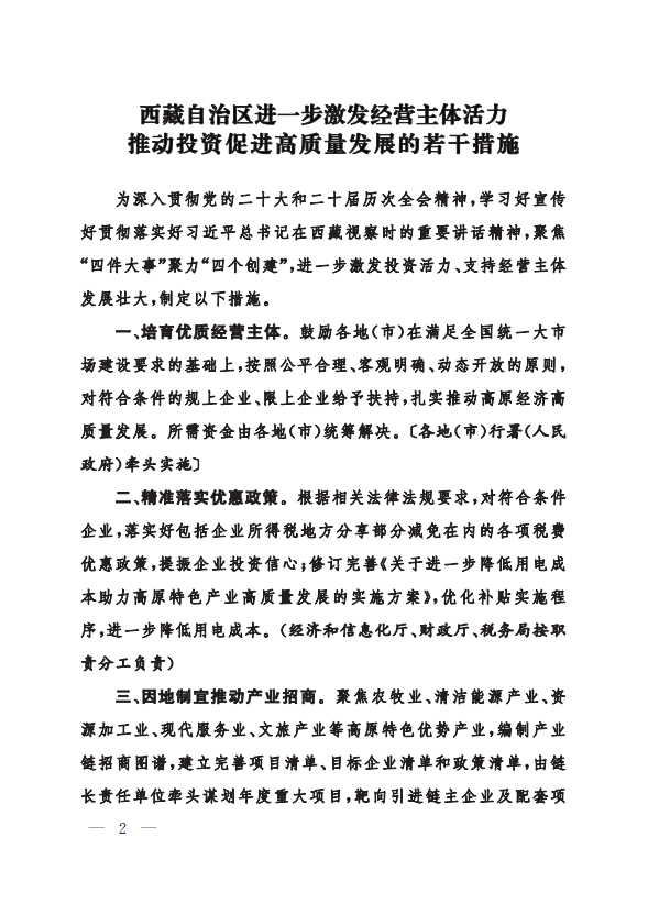 西藏自治區人民政府辦公廳關于印發《西藏自治區進一步激發經營主體活力推動投資促進高質量發展的若干措施》的通知
