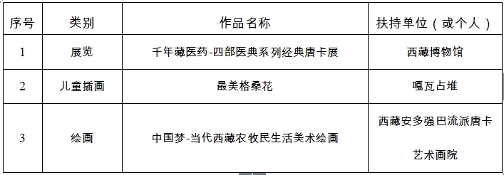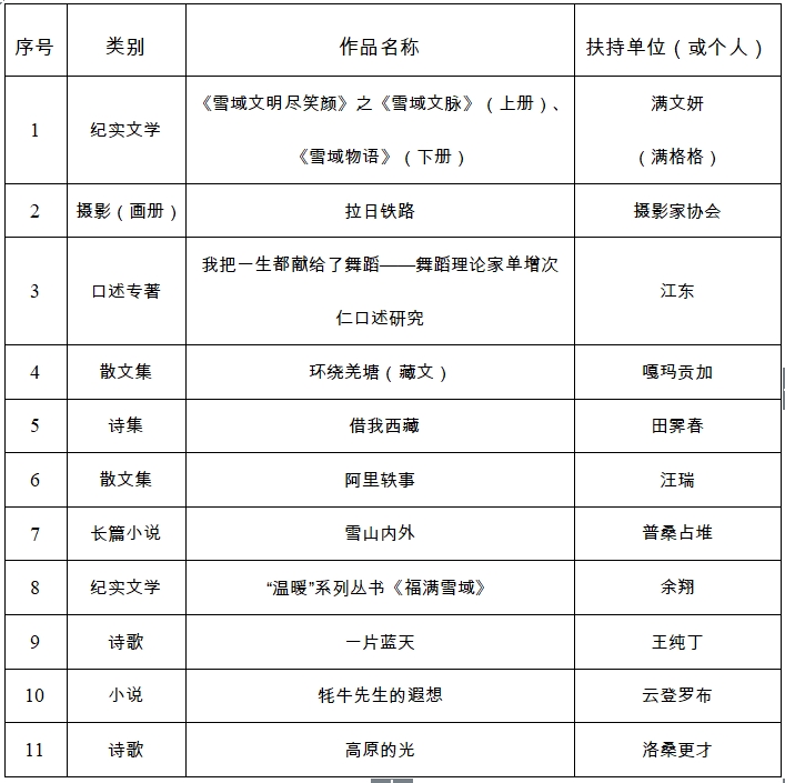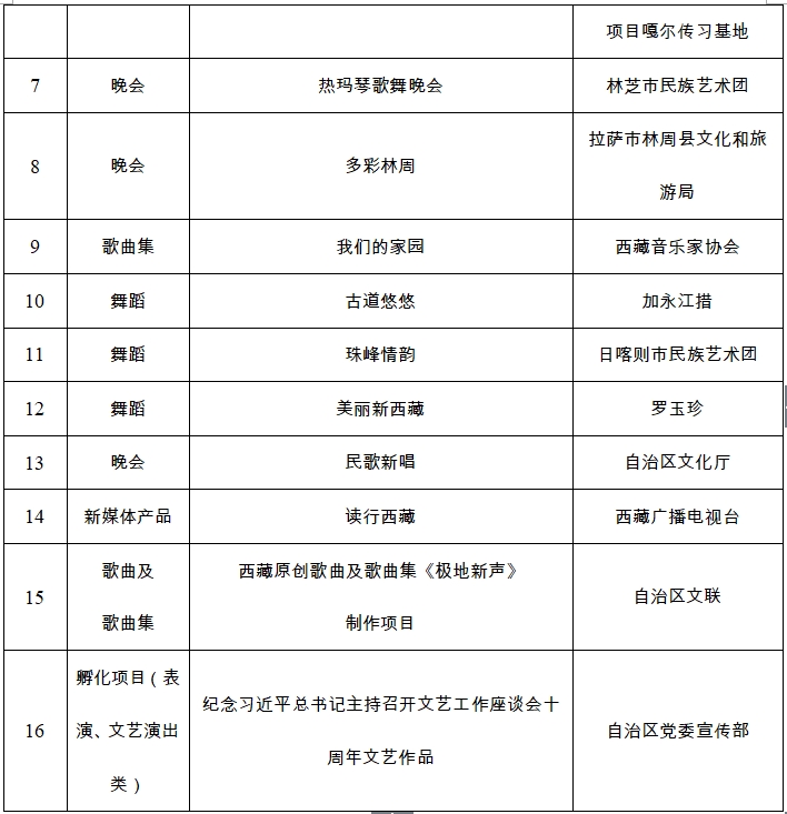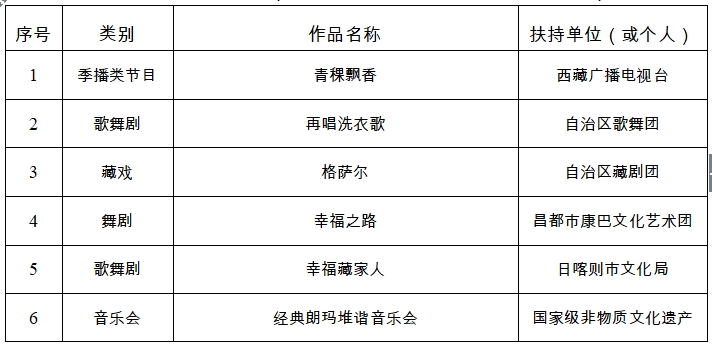 為深入貫徹落實黨的二十大精神和全國宣傳思想文化工作會議精神,貫徹落實習近平文化思想,貫徹落實自治區第十次黨代會精神,聚焦“四件大事”聚力“四個創建”,以鑄牢中華民族共同體意識為主線,堅持以人民為中心的創作導向,進一步繁榮新時代西藏文藝創作,促進西藏文化文藝事業高質量發展,鼓勵廣大文藝工作者及社會各界文藝人才創作推出一批思想精深、藝術精湛、制作精良的文藝精品,進一步推動西藏文藝從“高原”邁向“高峰”。根據《西藏自治區文藝創作扶持與獎勵辦法》(藏黨宣發〔2021〕38號)規定,經專家委員會審議通過,報自治區黨委宣傳部部務會會議研究,確定我區2024年度文藝創作扶持項目共計37項。其中,文學類作品11項,表演類作品16項,造型類作品3項,影視類作品7項。現將入選項目公示如下。